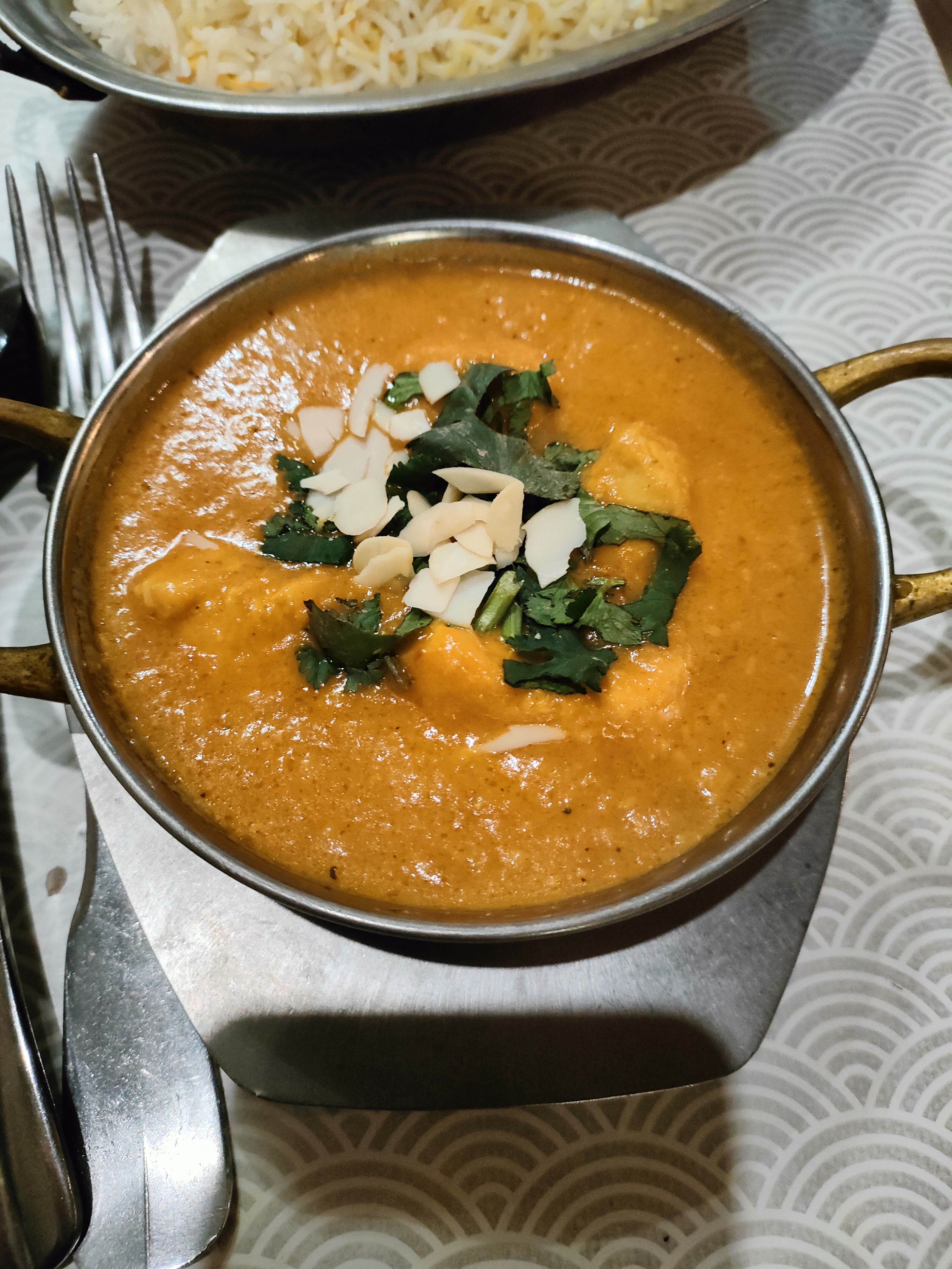 Les plats ne sont pas mauvais mais la carte ne présente aucune originalité. Qualité acceptable mais nous avons été déçus de ne voir que des plats à touristes (tikka masala, byriani, butter chicken etc), et des naans au fromage fourres a ce qui ressemble à du kiri- quand j’ai vu “fromage”, j’avoue que m’attendais à des naans au paneer où au moins à la mozzarella. Service passable également car j’avais demandé un plat sans riz, qui a été apporté avec du riz, les naans pour le repas apportés en entrée (?) et la carafe d’eau qui n’est jamais arrivée. Pour couronner le tout on demande nos restes à emporter et les 2 plats ont été mélangés en un Tupperware ! Super pour le lendemain…