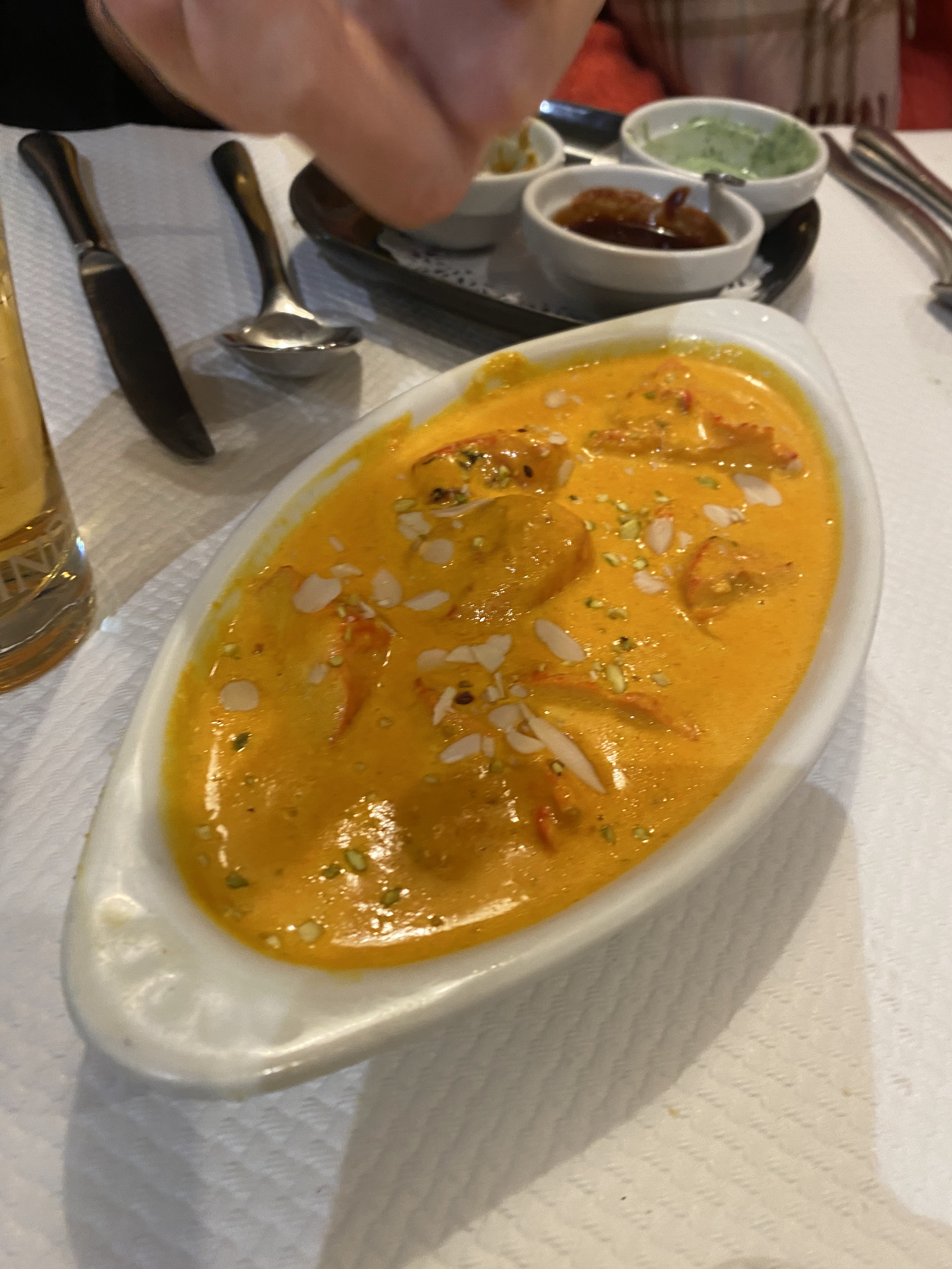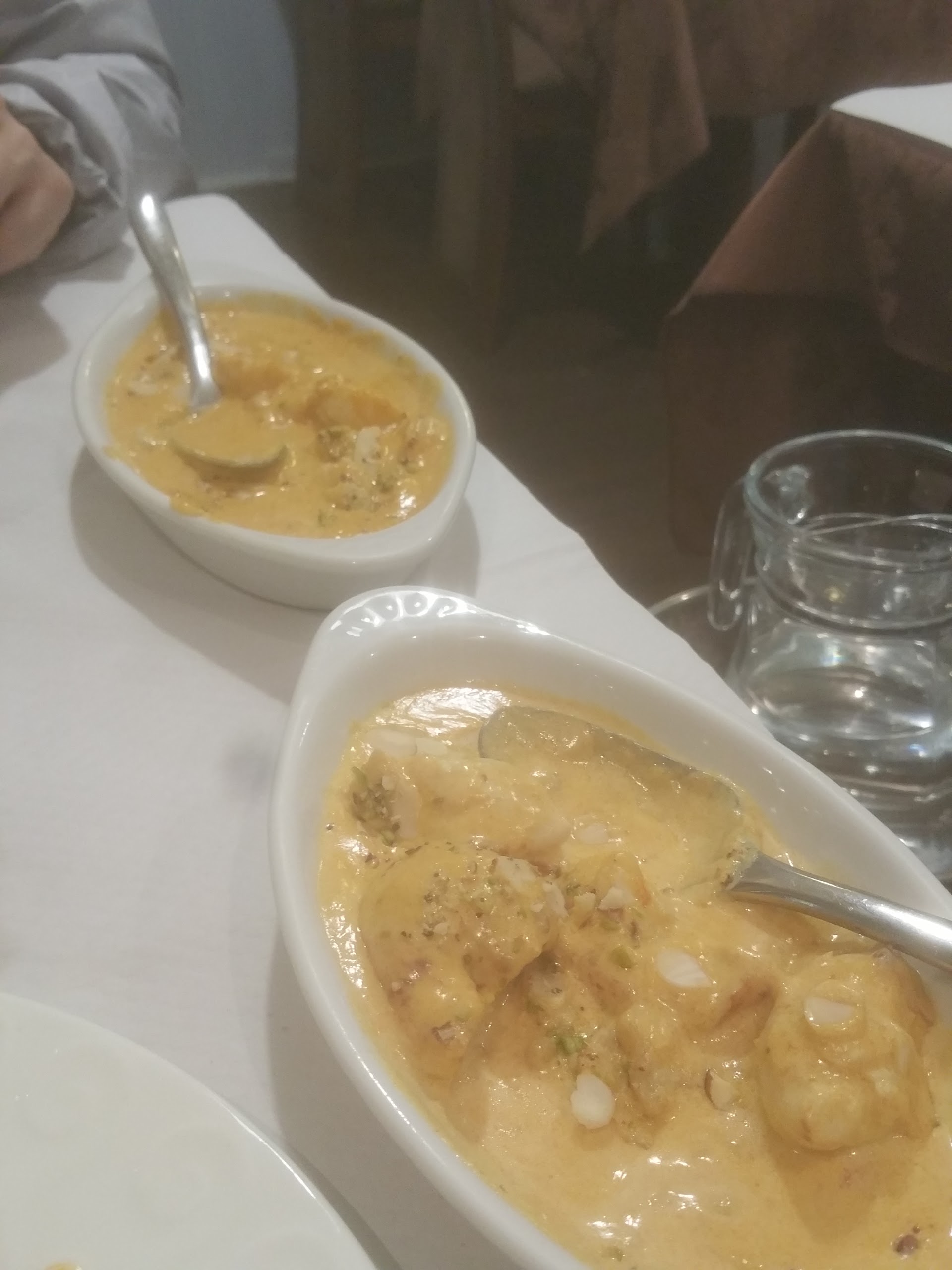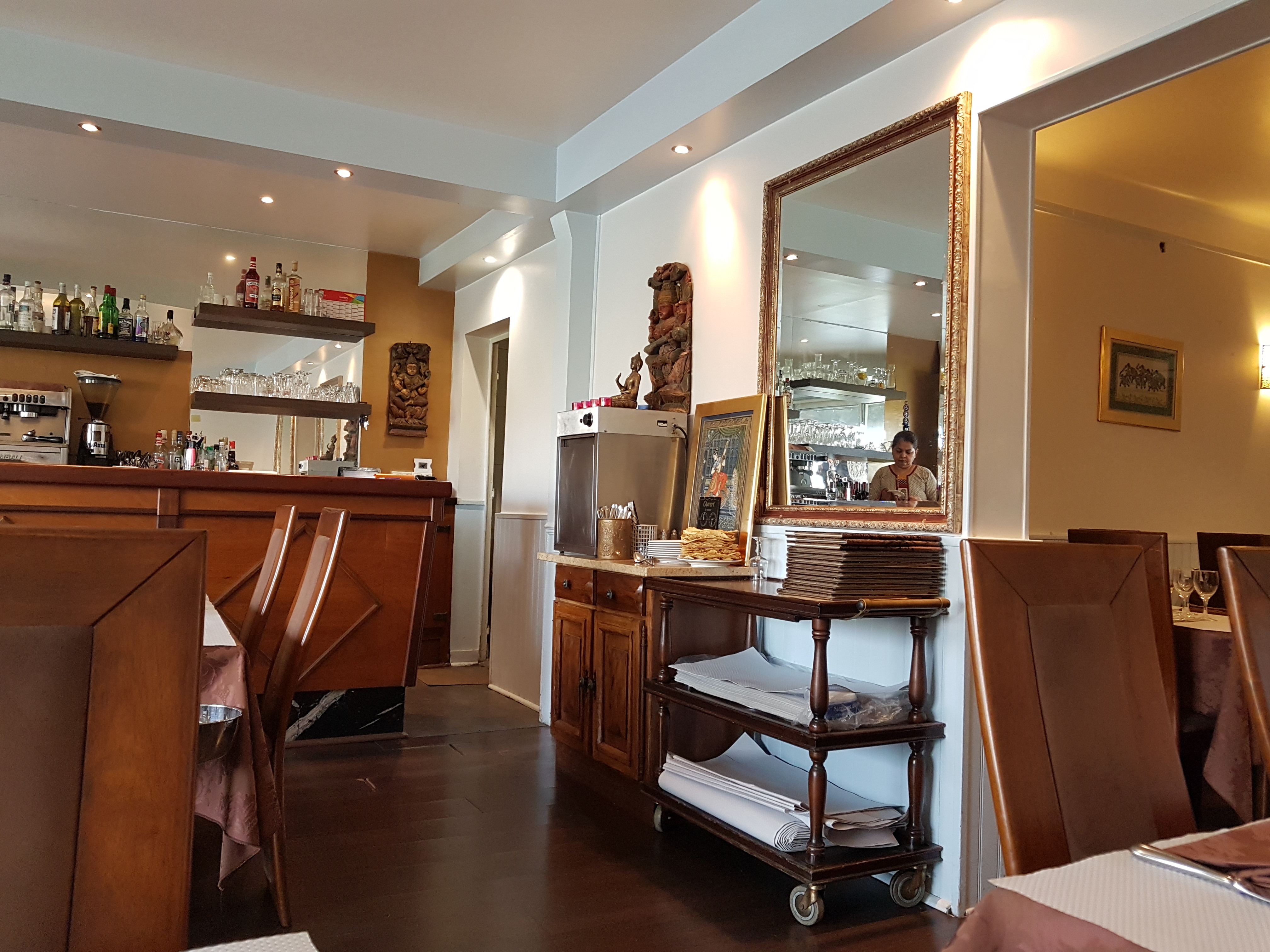 La déco est typiquement indienne, tout comme la carte. La décoration des tables auraient pu être plus soignés. Les nan fromage sont à la hauteur de son succès. La sauce du poulet Curry est très bonne malgré le manque de cuisson du poulet, peut-être que les morceaux étaient mal choisis. En dessert j'ai choisi un kalfi à la pistache, un dessert avec peu d'intérêt. Le service était bien.