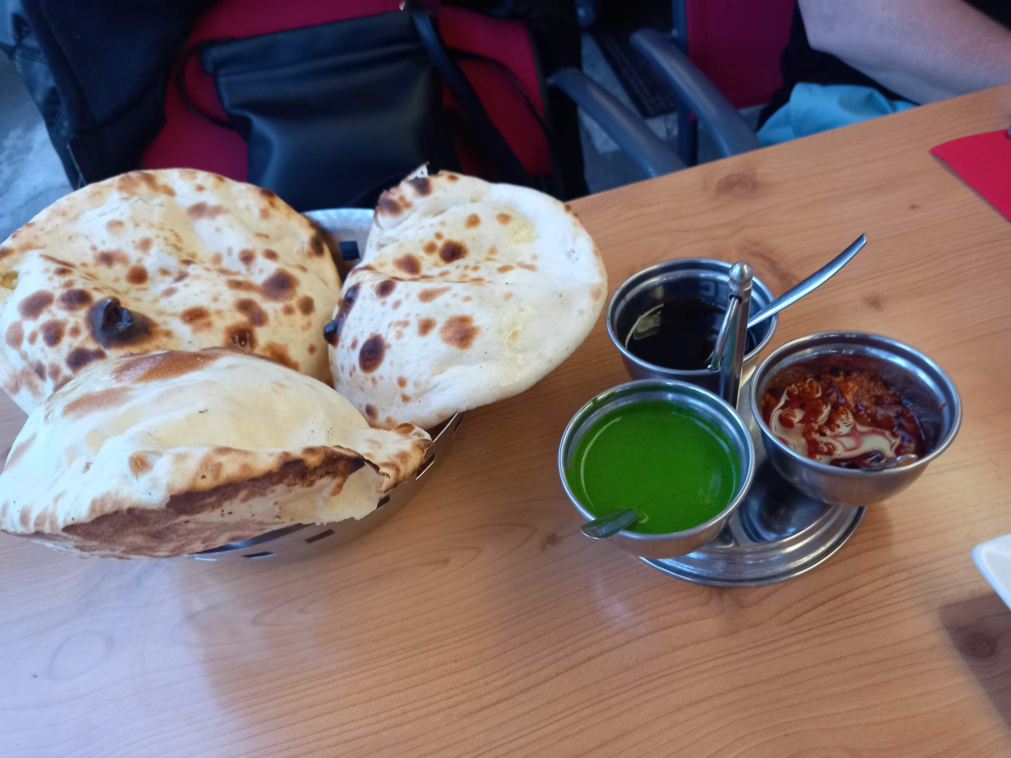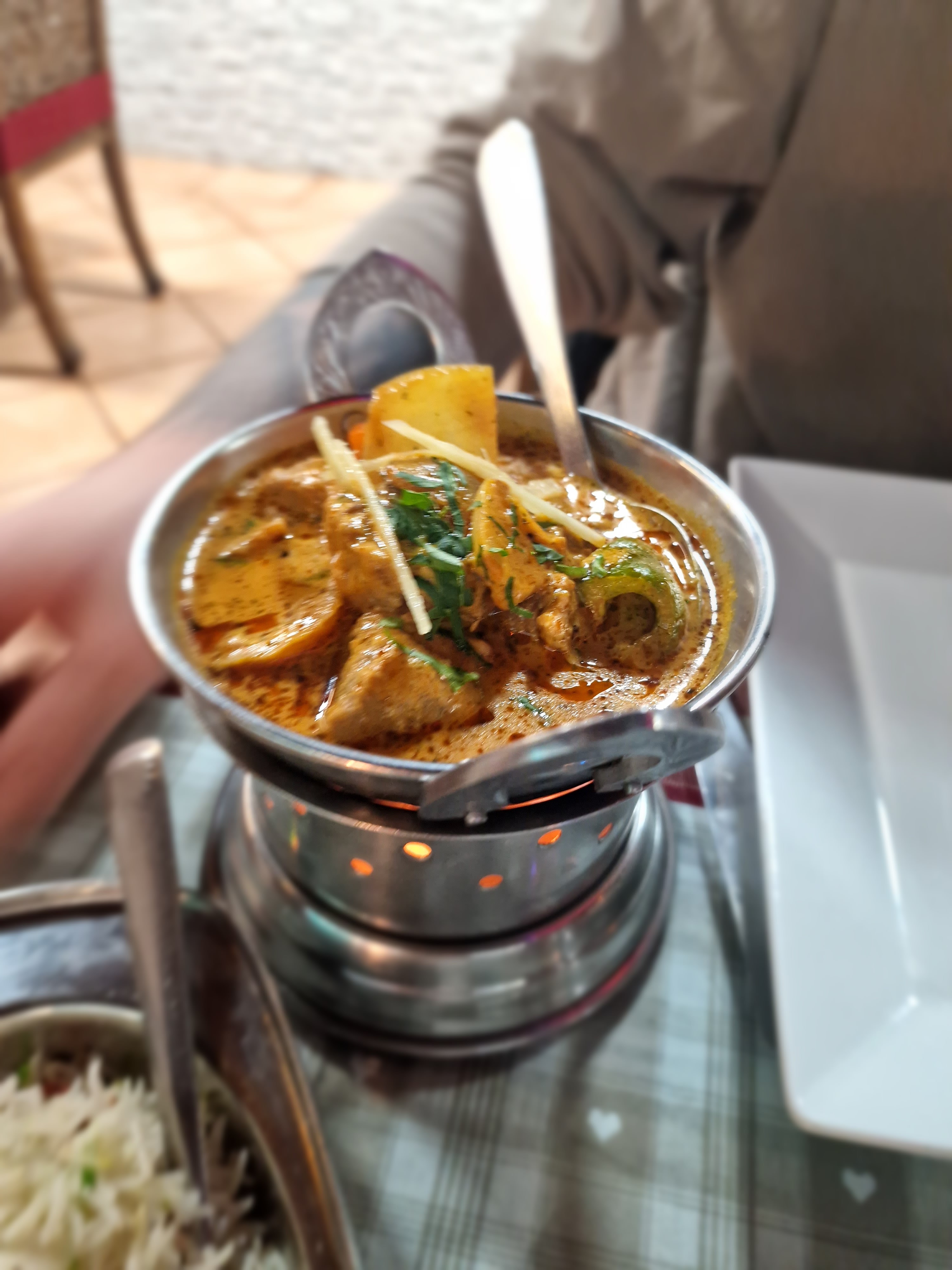 Avons commandé pour emporter, les portions étaient copieuses et pleines de saveurs ! Épicé mais pas trop : PARFAIT. Des naans légers et moelleux...Je recommande !