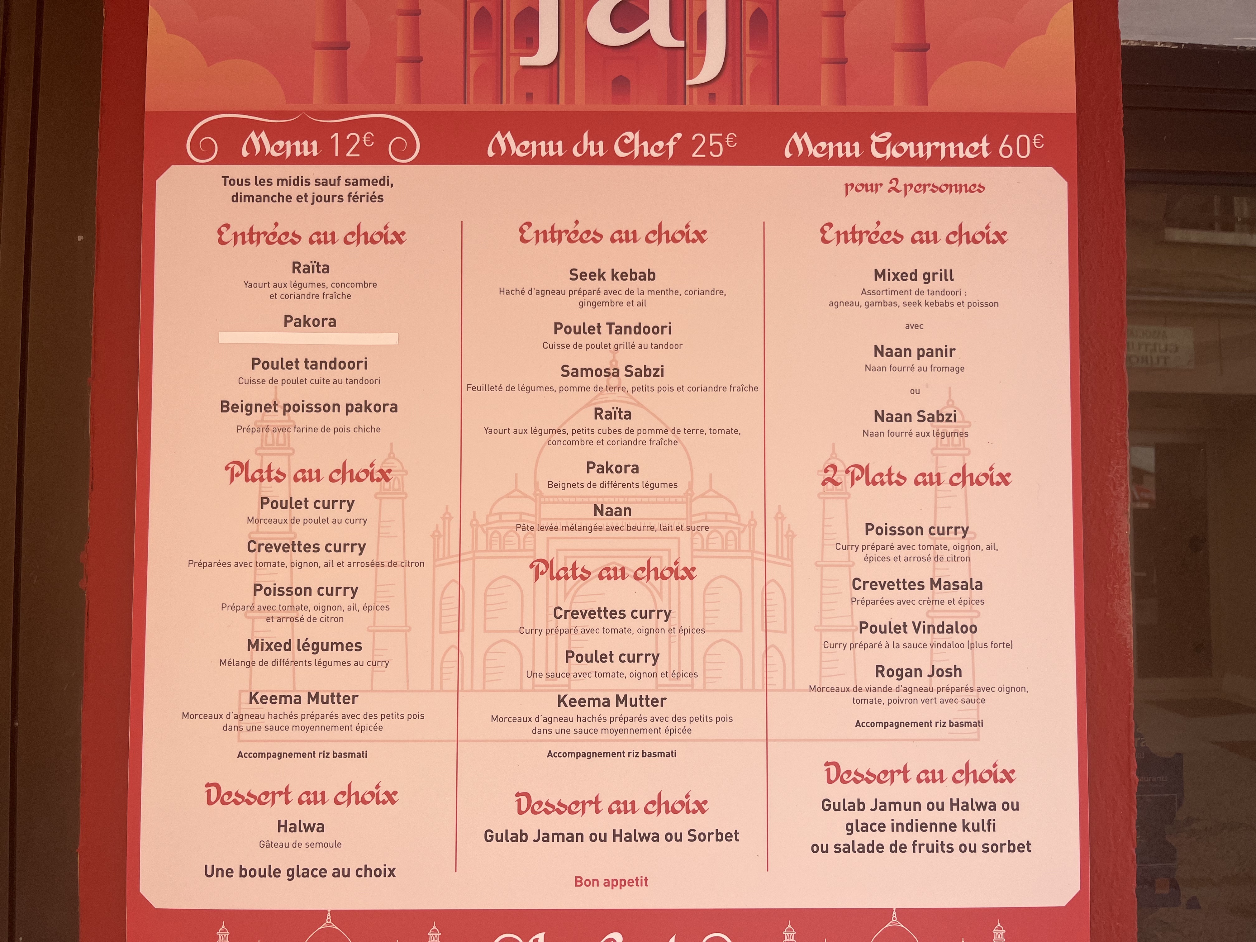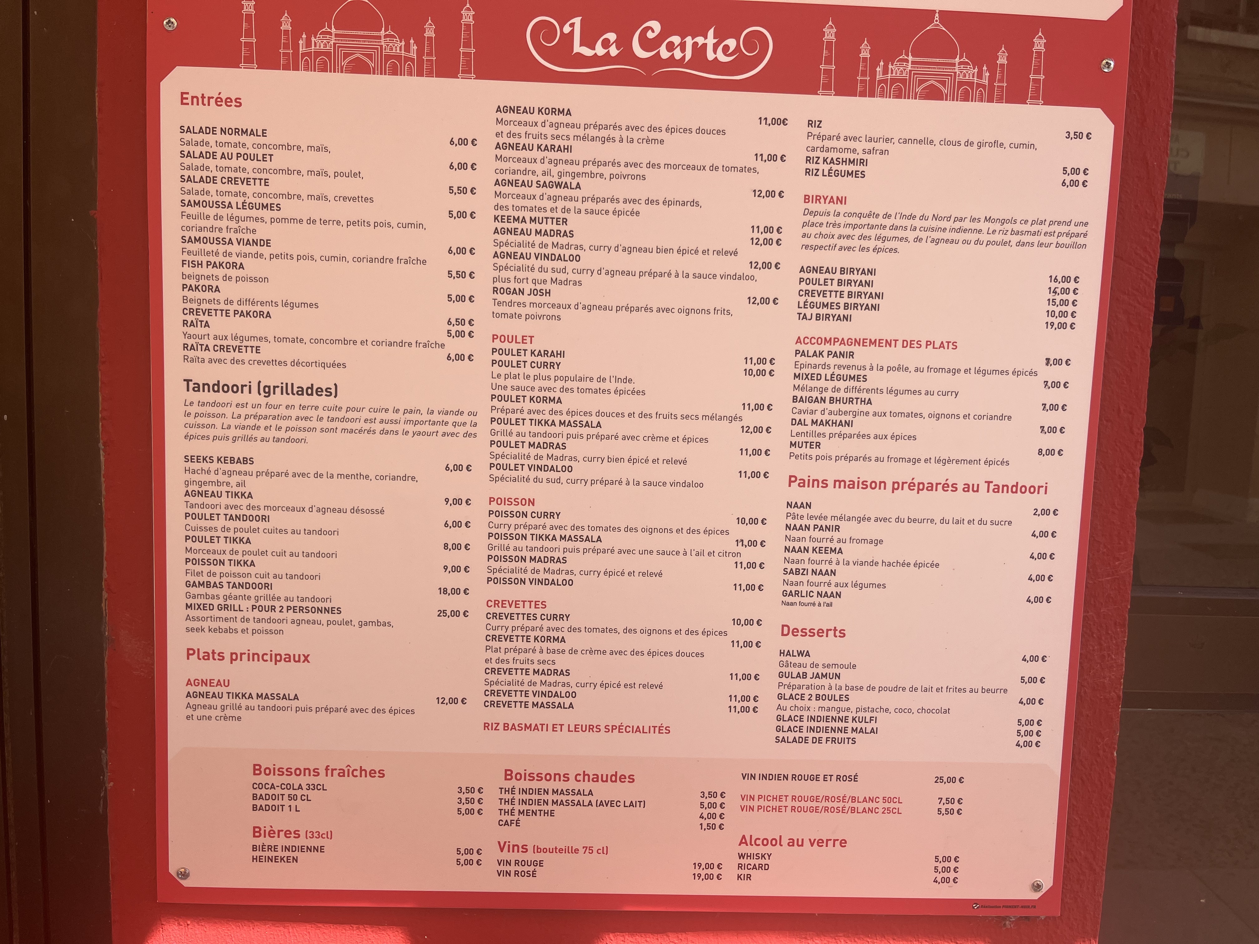 Excellent accueil par le restaurateur (un indien). Des plats vraiment très bon pour les amateurs de la cuisine épicée. Je recommande le raita en entree avec un naam à l'ail et l'agneau Vindaloo. Un vrai régal. excellent rapport qualité prix.