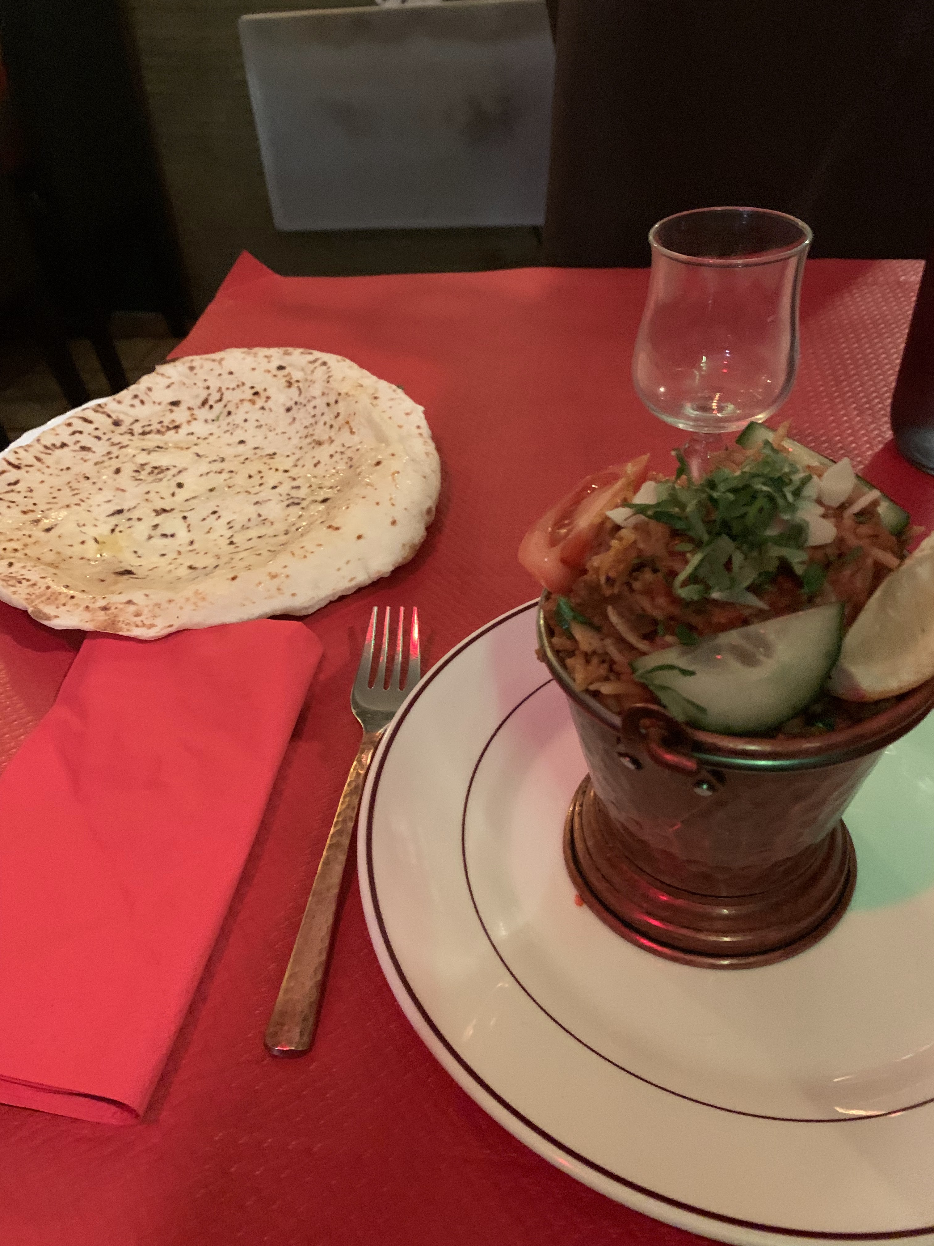 Très goûteux et copieux. Photo du plat agneau byriani et le cheese nan. Aussi je vous conseille le thé massala, doux et légèrement épicé. Chouette ambiance car restaurant intimiste tenu par un couple d’une très grande gentillesse. J’ai vu un article dans l’express de 2017 qui recommandait ce restaurant.