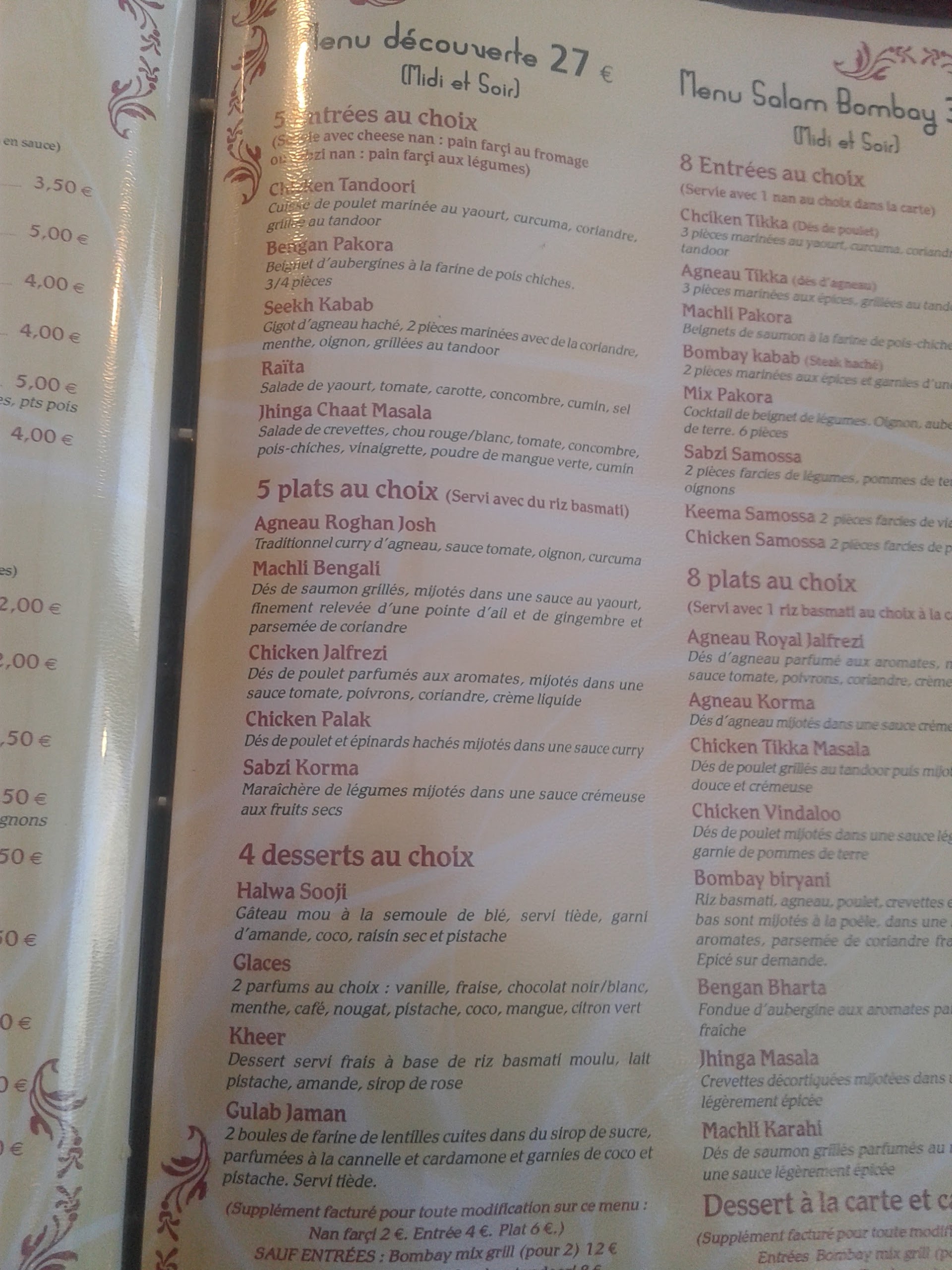Pour avoir goûté plusieurs indiens , leur riz n’est pas top , les légumes ce sont des légumes surgelés et la viande est ni bonne ni mauvaise sans + , je vous conseille l’himalaya à evry qui est bon et moins cher. Car salam bombay est cher pour la qualité de leurs produits
