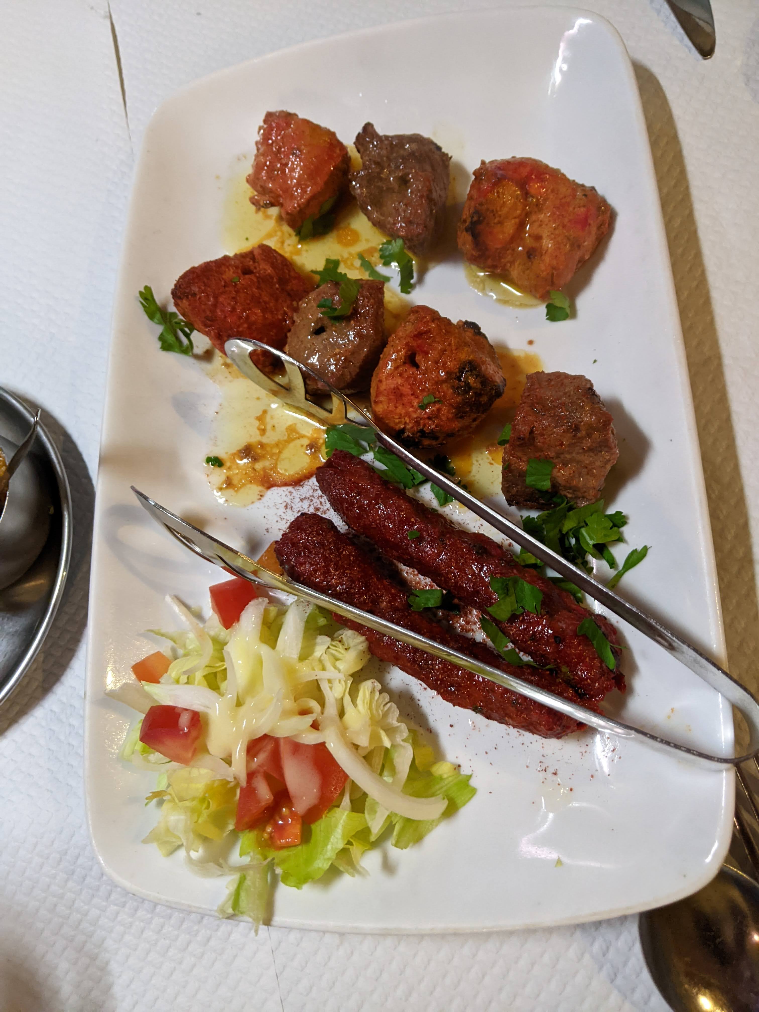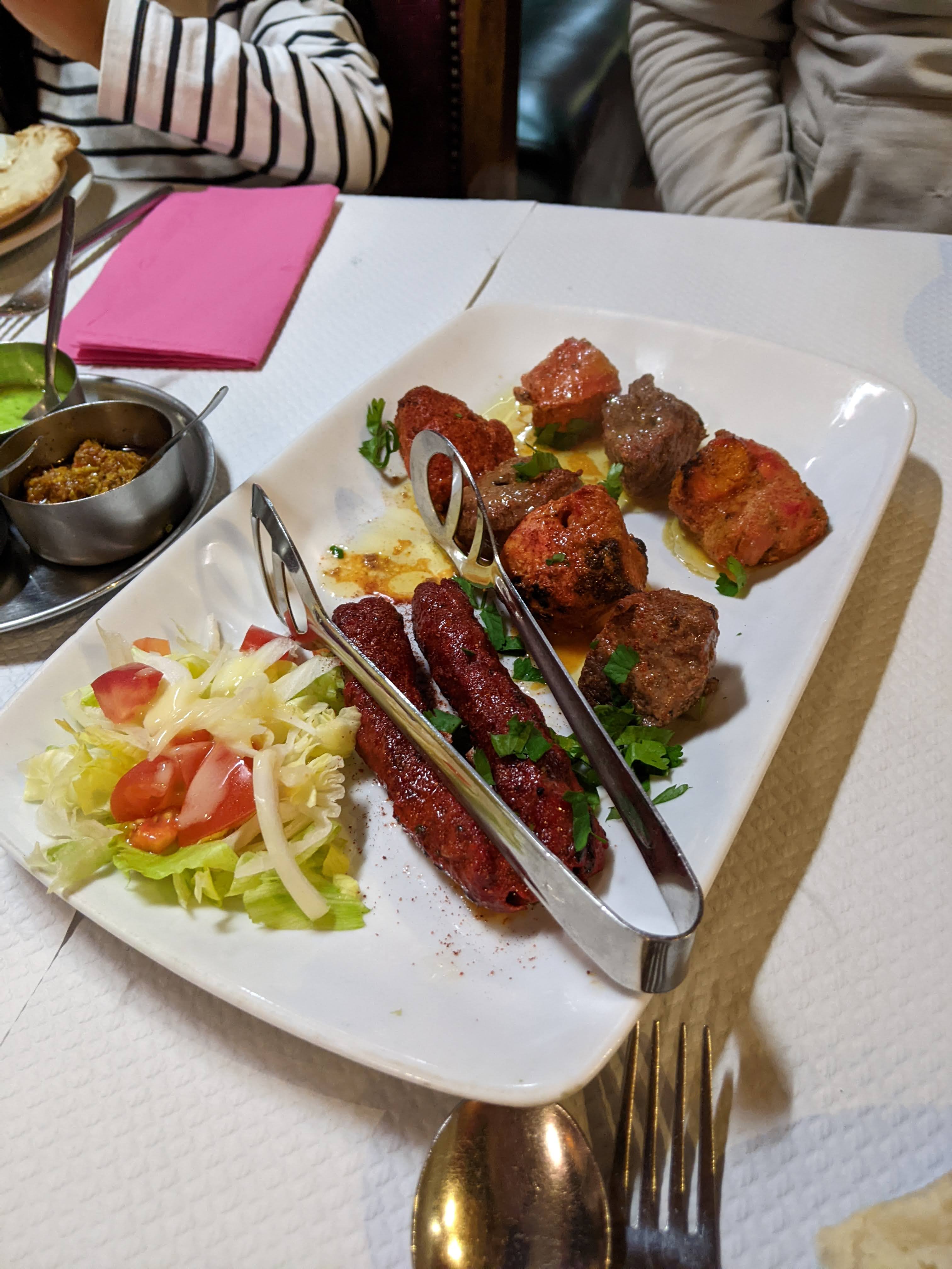 Beignets de légumes et samoussas végétariens en entrée, mix sabzi et poulet tandoori, tout était parfait ! Le tout pour 33 euros à deux, le bonheur !