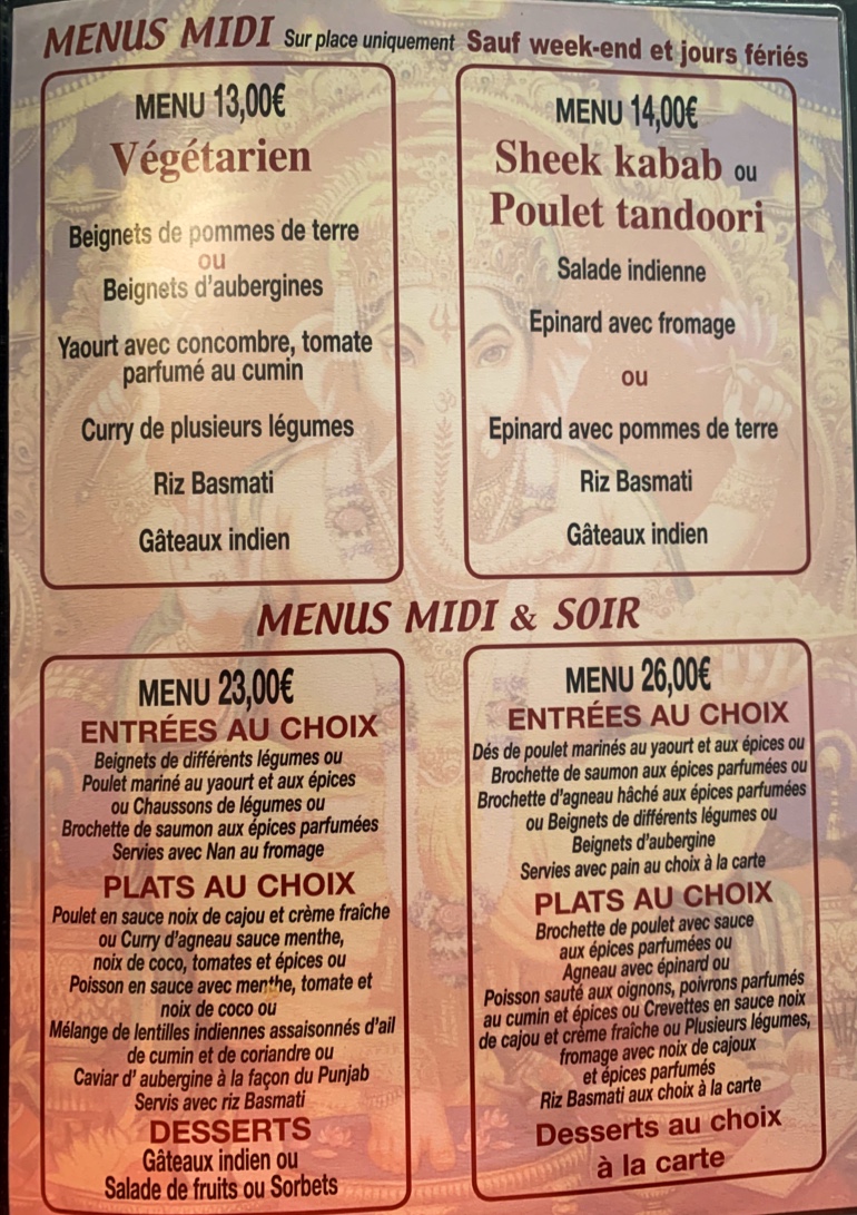 Le meilleur restaurant indien que j’ai fait pour le moment on me la conseiller depuis et malgré la distance sa le vaut le coup ! Menu a 24€90 avec son entrée , plat et dessert Les chesse nan au fromage sont excellent ! Lassi sucrée mangue a 4€ , un délice Un super service du personnel très discret et professionnel avec une bonne ambiance indienne pour la musique Prévoir de se garer dans les alentours pour le stationnement.
