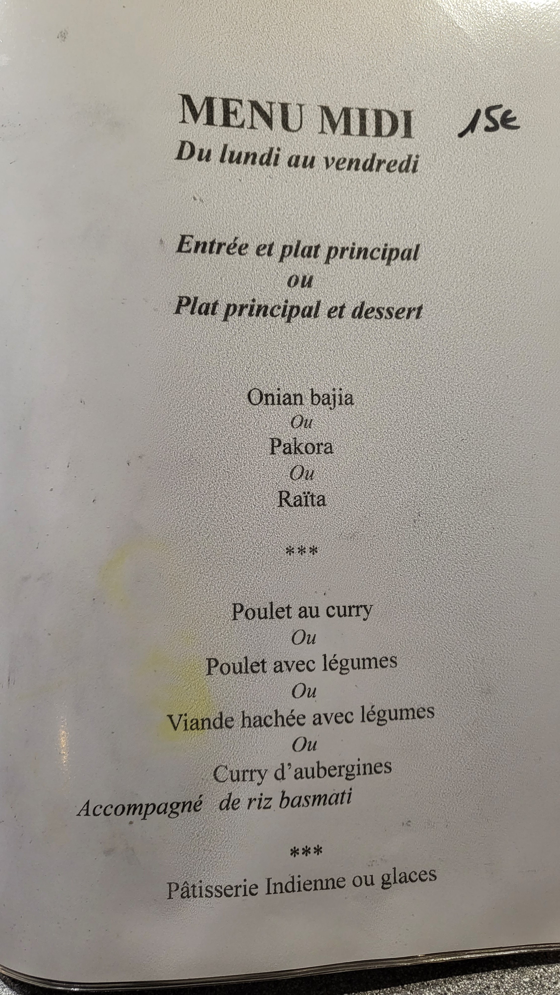 Au premier abord, on pourrait penser que le restaurant n'est pas ouvert. Il est vrai qu'il aurait peut être besoin d'un rafraîchissement de décoration mais cela est vite oublié lorsquele propriétaire, seul en cuisine et réceptionne (soyez patients ça vaut le coup), vous accueille avec le sourire et surtout que les plats arrivent. De l'entrée au dessert, un vrai régal, une cuisine Indienne digne de ce que j'ai pu goûter en Angleterre ! Les plats peuvent être relevés selon les goûts et est adapté au palais juvénile d'un enfant ou le palais d'un adepte de cuisine épicée. On y reviendra!