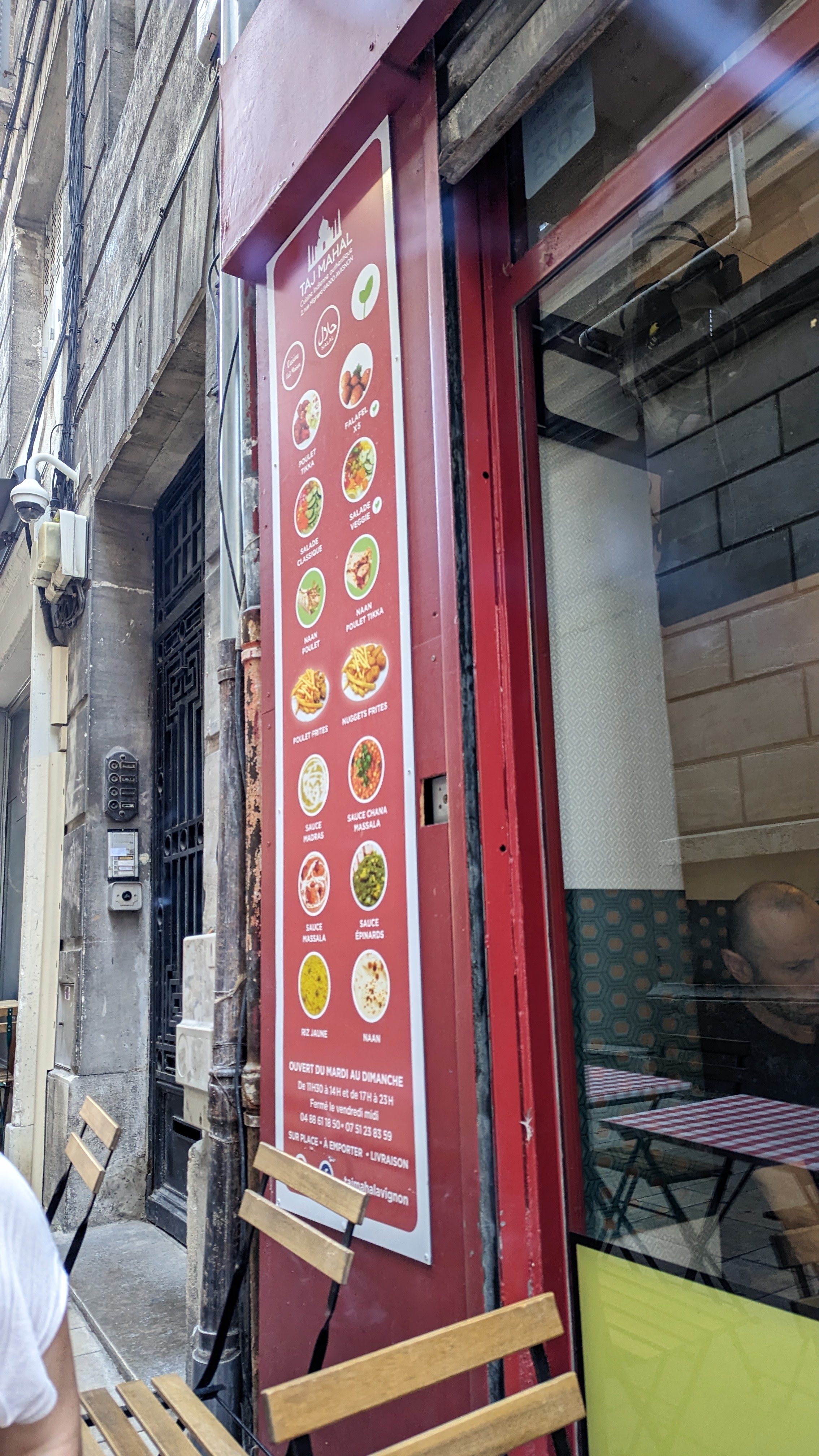 nous avons pris a emporter et finalement pas emporter si loin puisque nous avons déguster devant le restaurant sur les 2 petites tables mises à disposition par les restaurant . Les plats étaient excellent . Habitant hors du centre ca m'embête un peu d'aller dans Avignon juste pour manger mais je ferai l'effort et j'y retournerai avec plaisir tellement c'était bon . Surtout à ne pas manquer si vous voulez manger un très bon plat indien .