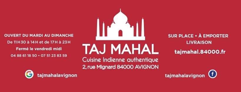Voici toutes les informations sur le Restaurant indien Taj Mahal qui ce trouve au 2 Rue Mignard, 84000 Avignon (84). Sur cette fiche vous trouverez les photos, l'adresse, les horaires d'ouverture, le numero de téléphone et les avis clients.Vous pouvez églement rédiger un avis si vous le souhaitez en bas de page.