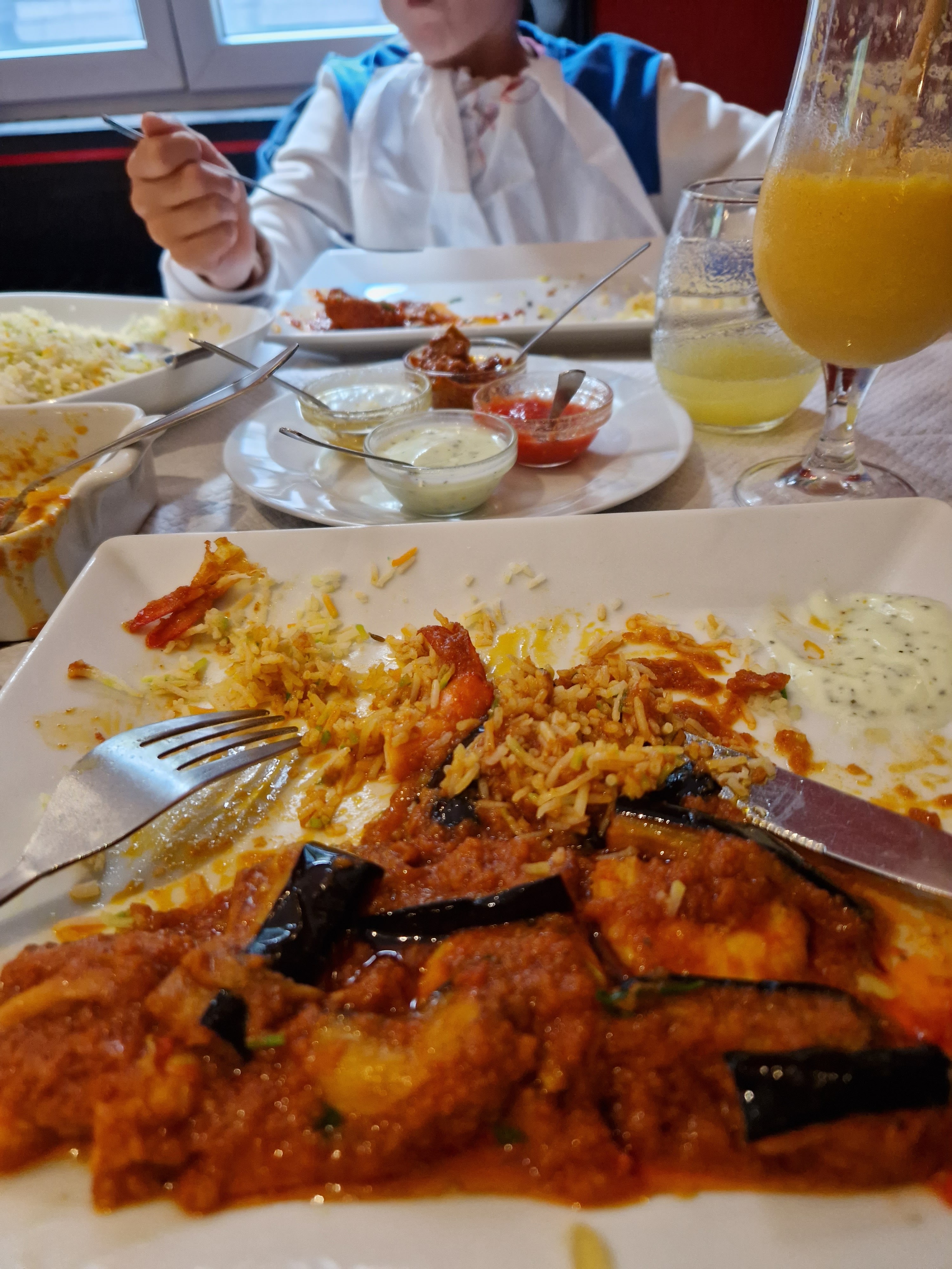 Bonne qualité des plats et bonne quantité (pour le menu pour 2 à 50 euros en tout cas). J'ai particulièrement aimé l'agneau tikka. Le menu enfant un peu cher (12€) mais copieux. Déco typique (on aime ou on aime pas :)), musique style bollywood qui a hypnotisé un de mes fils car les clips passent en même temps.