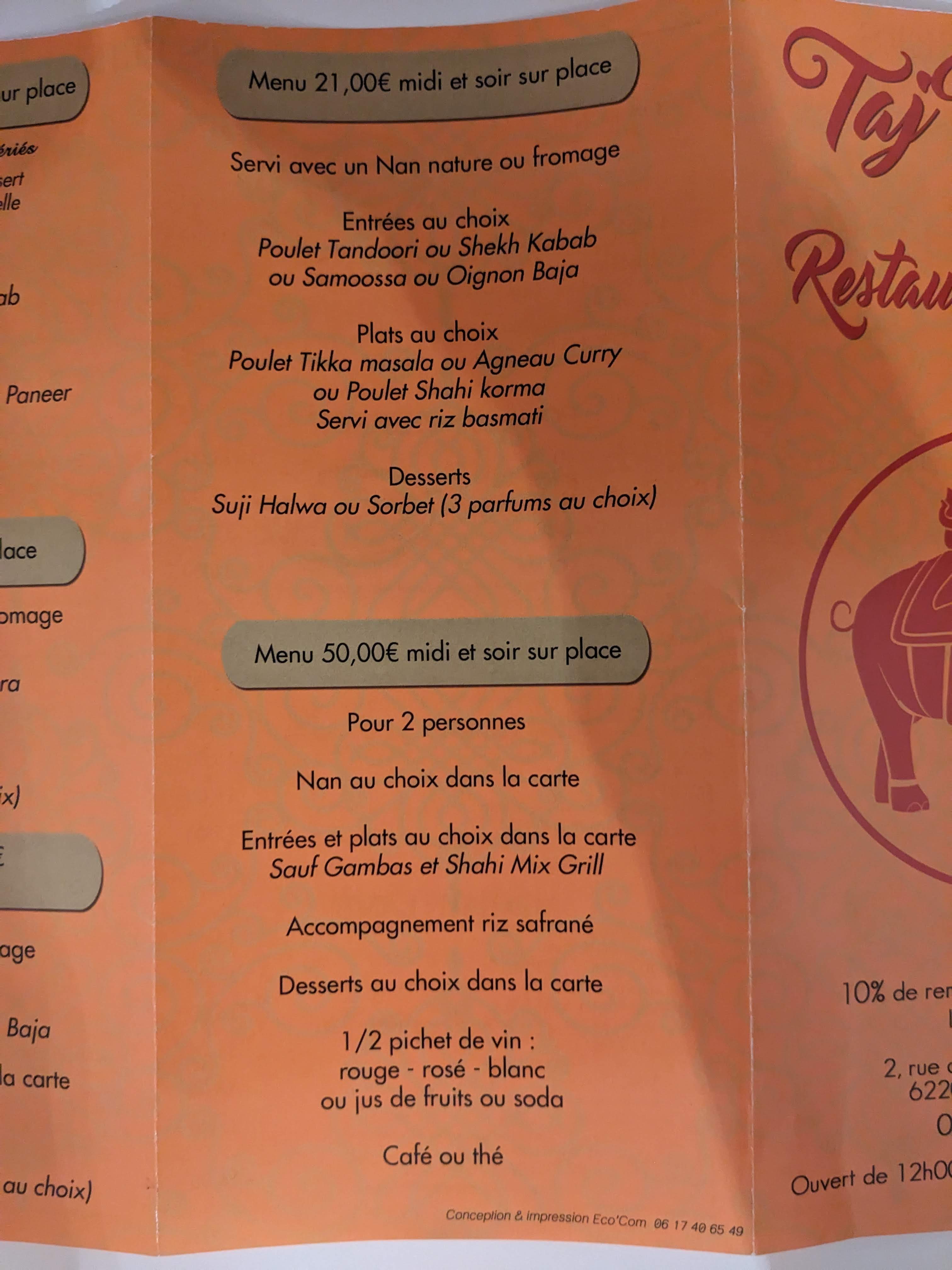 Si vous voulez manger dans un restaurant indien, je vous recommande fortement le Taj Mahal à Boulogne sur Mer ! L’accueil, les saveurs et le prix, tout y est ! Au plaisir d’y retourner à mon prochain passage ici