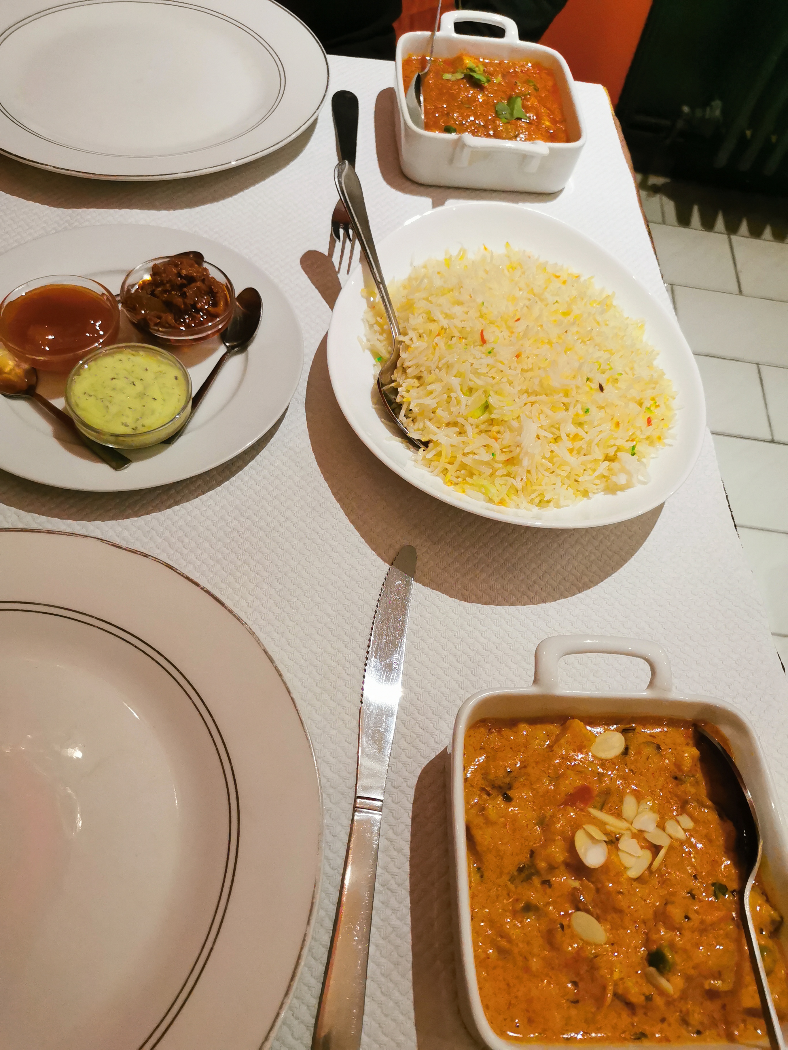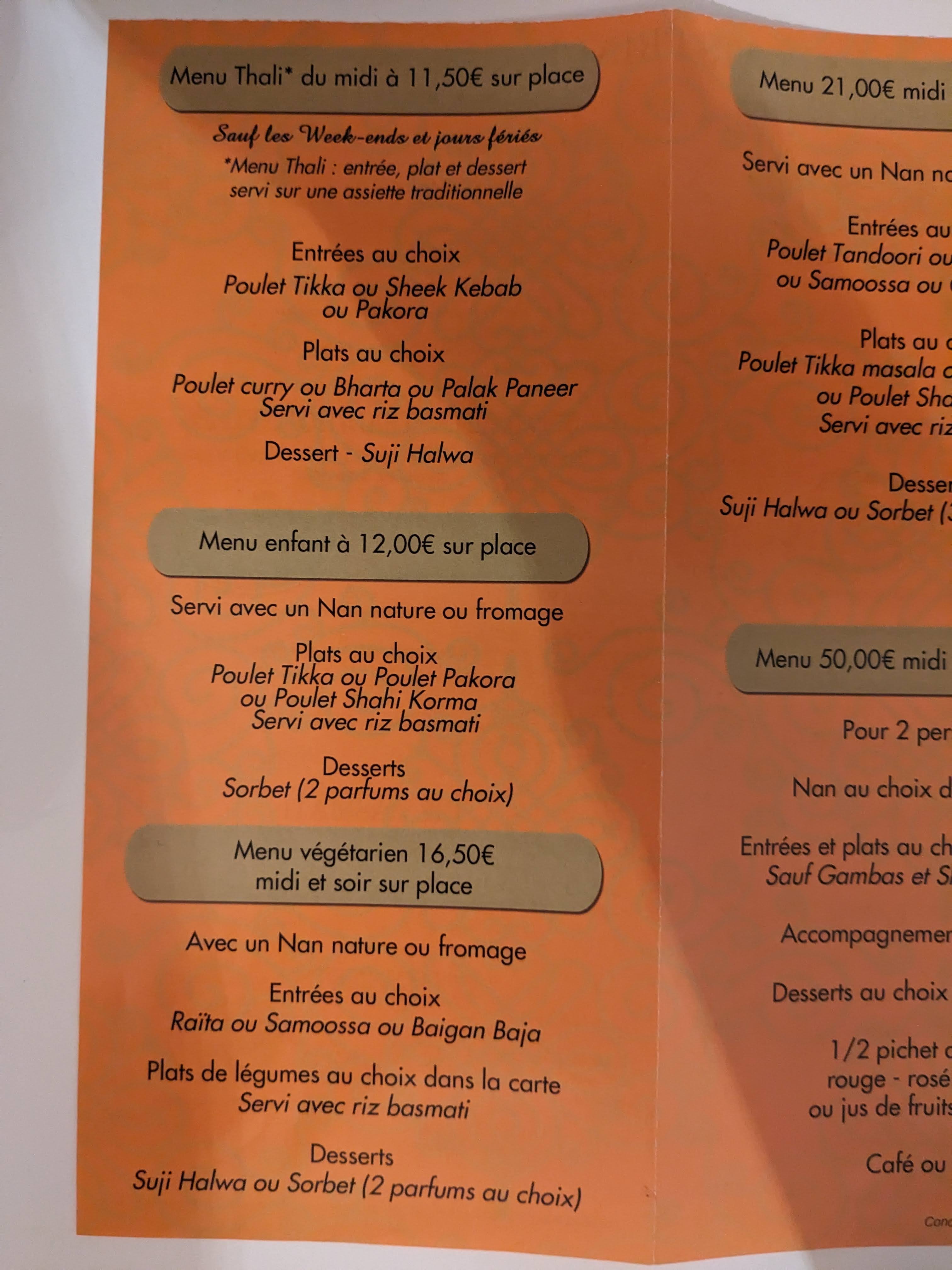 Le repas était bon. Mais, l'endroit est sale, et il faut prendre en menu pour ne pas avoir la surprise de payer 5 euros pour le riz. Le riz n'est pas compris dans le plat pour un restaurant indien. Résultats un menu 21 euros(entrée+plat+ dessert +boisson) Le plat +le riz du coup+boisson +une entrée 30 euros... Je ne recommande pas malgré que ce soit bon. A ce tarif il y a bien mieux à moins d'un kilomètres. Et un coup de nettoyage ne serai pas de trop.