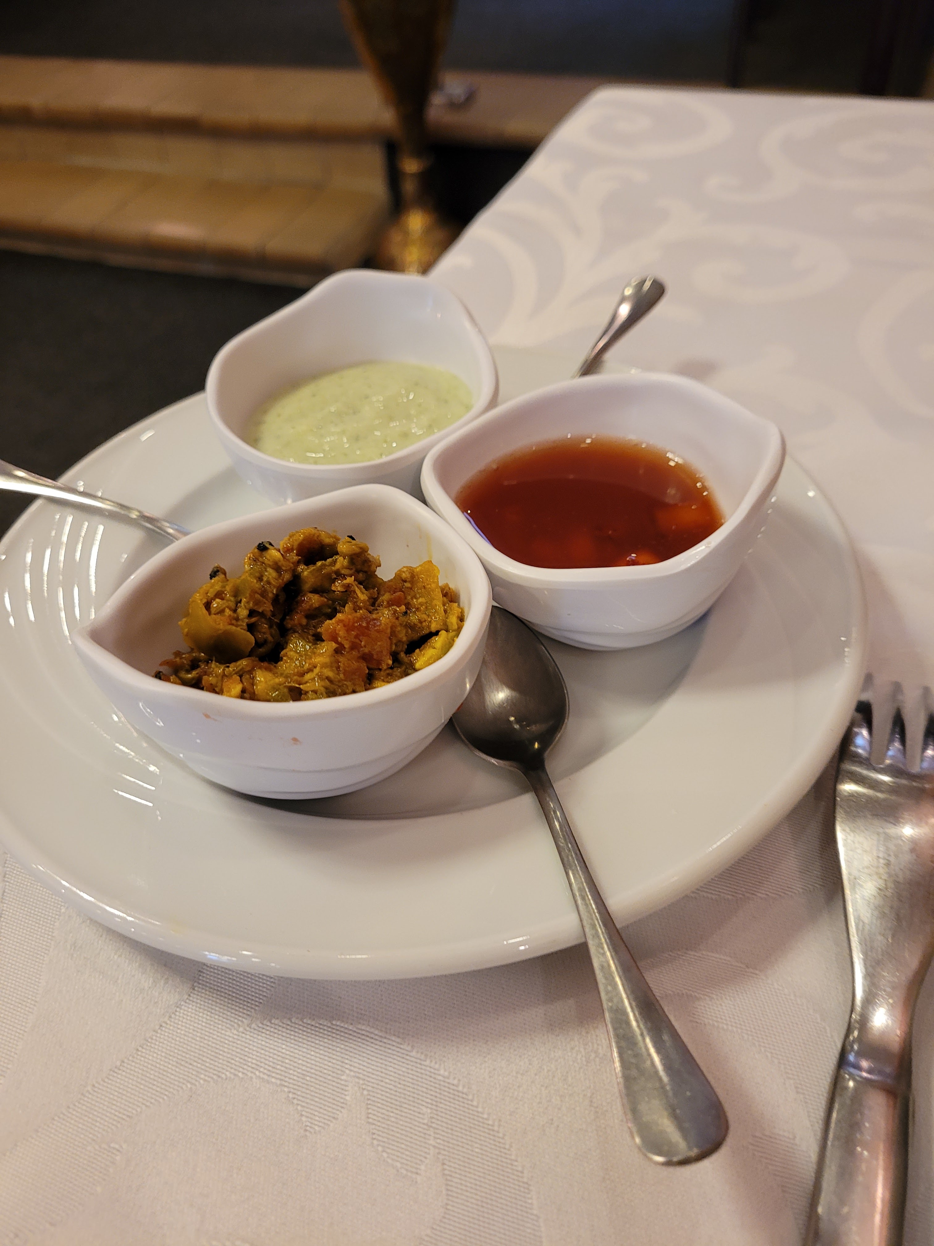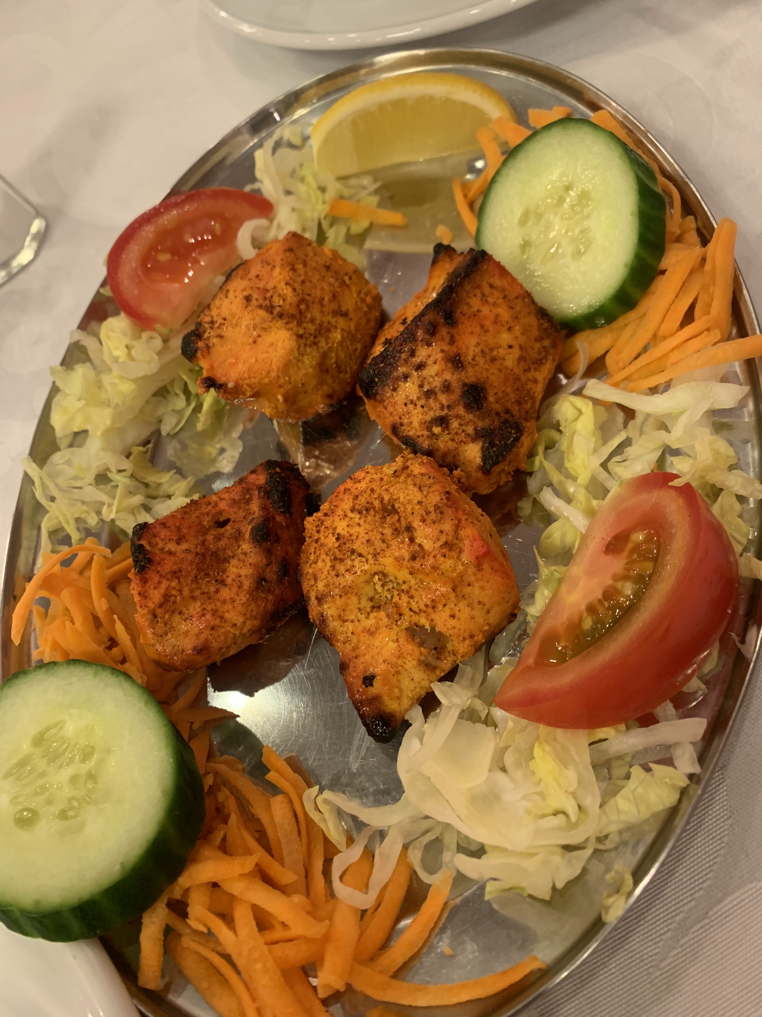 Lorsque l'on rentre, une bonne odeur d'épices nous accueille. L'accueil est, quand à lui simple et chaleureux. Le serveur avec qui nous avons eu à faire et un peu trop effacé mais fort poli et très gentil. La décoration, dans les tons rouge parsemé de dorure colle avec la musique indienne discrète. La table est sobre et de qualité avec ses nappes et ses serviettes en tissu blanc et rouge. Tout est nickel et propre. L'endroit n'est pas grand mais fait qu'il y a un côté cocooning. L'entrée, poisson Tikka accompagné de son nam fromage et 3 petites sauces (une fraîche, une sucré et une épicée) très bon, le poisson se mange tout seul et est assaisonné comme il faut. Les 3 sauces ajoutent la touche que vous souhaitez (si vous voulez plus ou moins épicé) et le pain nam se mange tout seul également mais j'en garde un peu pour la suite de repas. Le plat principal, Poulet Tikka Masala. C'est servi dans un petit plat en métal avec sa cuillère, le riz pilla et également servis à part. Et c'est pas plus mal car on peut doser soit même son assiette et on peut également partager avec la ou les personnes avec nous, ce qui rajoute un côté familial et un moment de partage au plat fort agréable. Malgré la portion qui paraît petite à première vue, on en a pour notre argent et on en sort bien rassasié. Le plat en lui même n'est pas trop épicé et est bien dosé pour ma part. Pour ceux qui n'aiment pas les légumes comme moi, ils sont mijotés dans le plat et sont fondants de ce fait, forts agréables. Le riz pilla (une belle portion soit dit en passant)est incroyable, parfumé et doux et accompagne parfaitement mon plat. En résumé, accueil agréable même si un peu discret. Le service est rapide. Une belle découverte au niveau des saveurs et les prix sont en adéquation avec ce que l'on nous sert. C'est une belle adresse qui mérite le détour si vous êtes dans le coin.