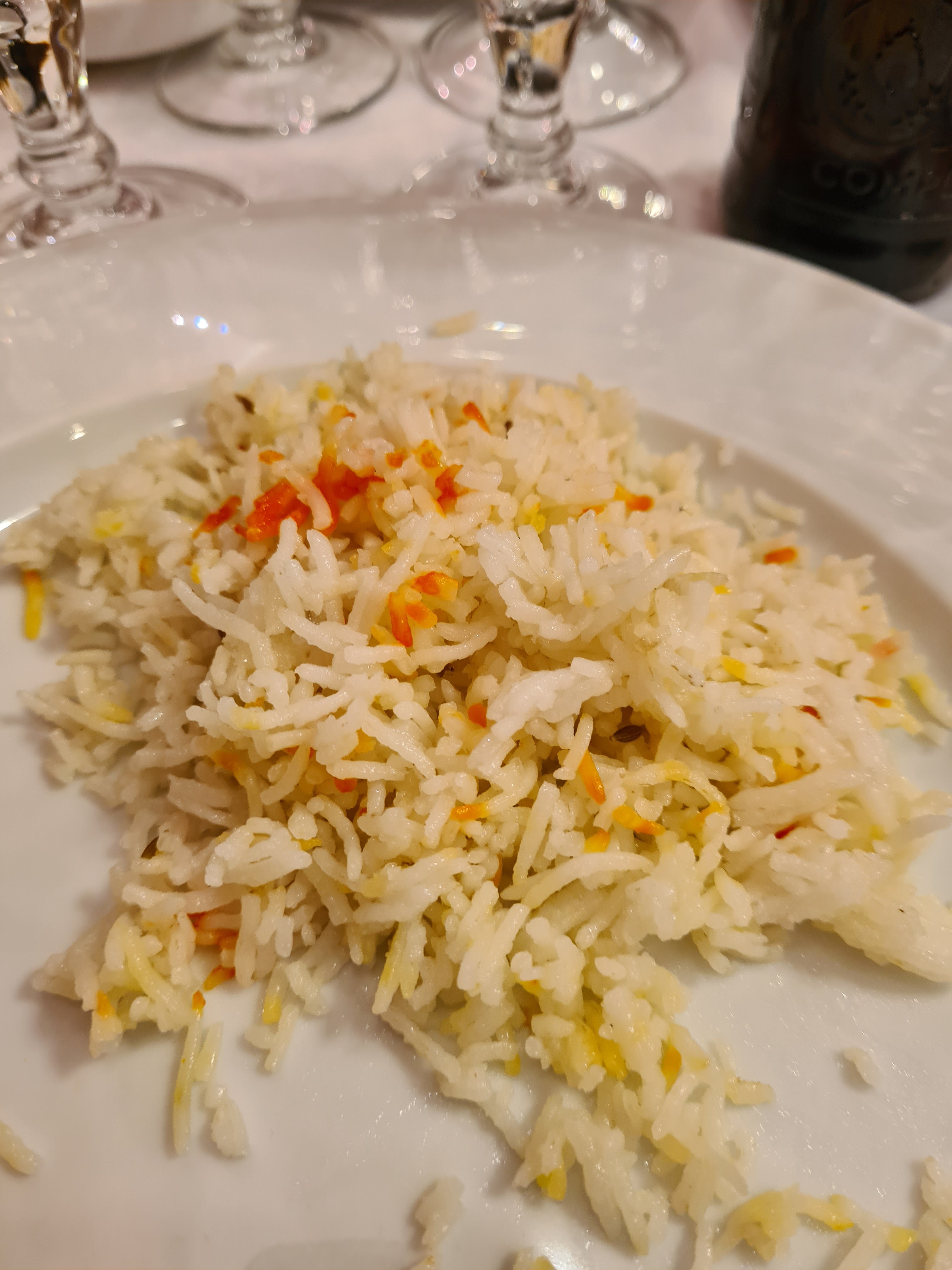 Restaurant idéal pour un dîner discret. La musique d'ambiance est un peu trop forte à mon goût. Les plats sont très bien préparés. Le vin rouge indien s'accorde parfaitement avec l'agneau curry. Mais en Inde, la King fisher est de rigueur à table non ?