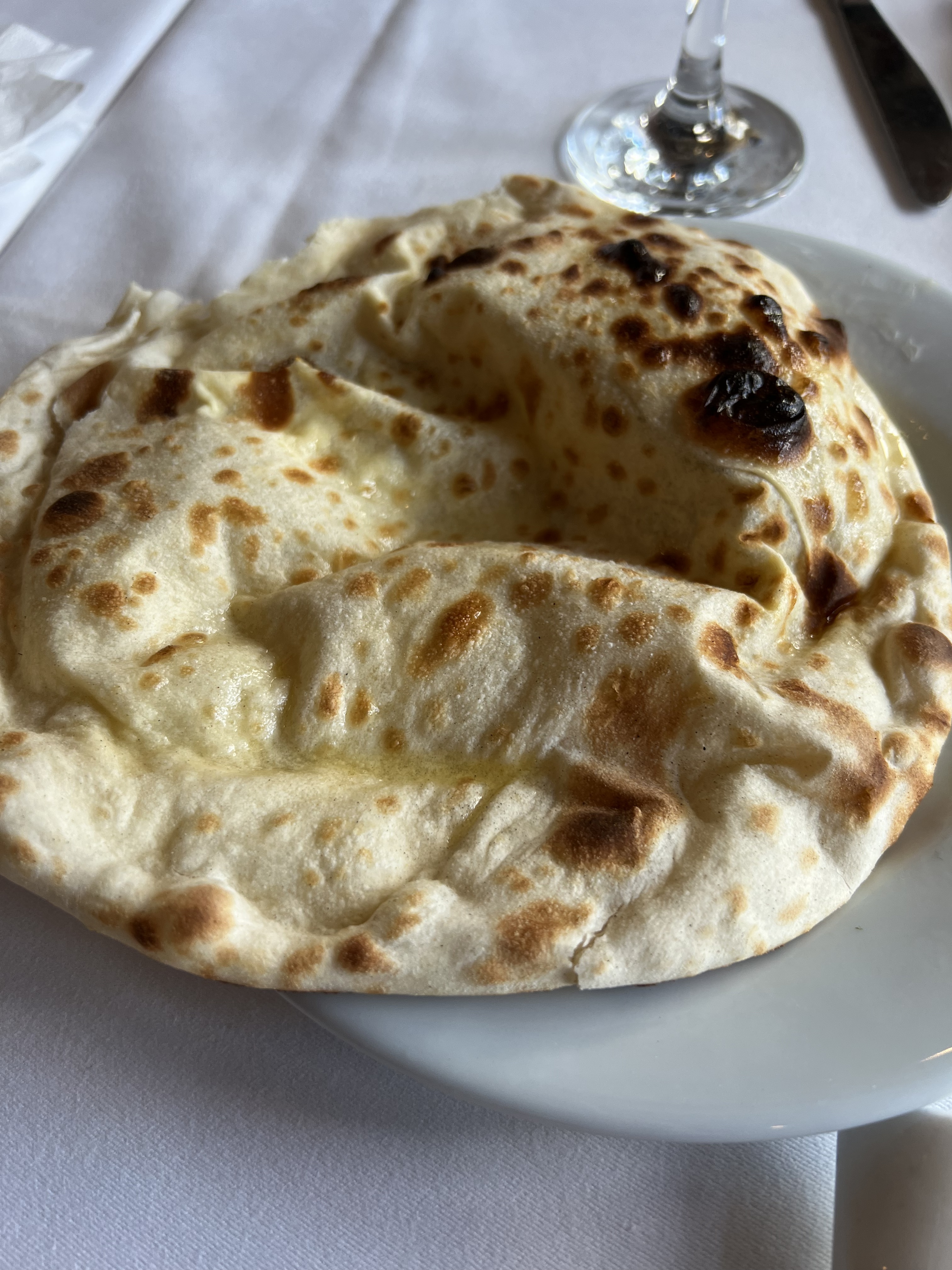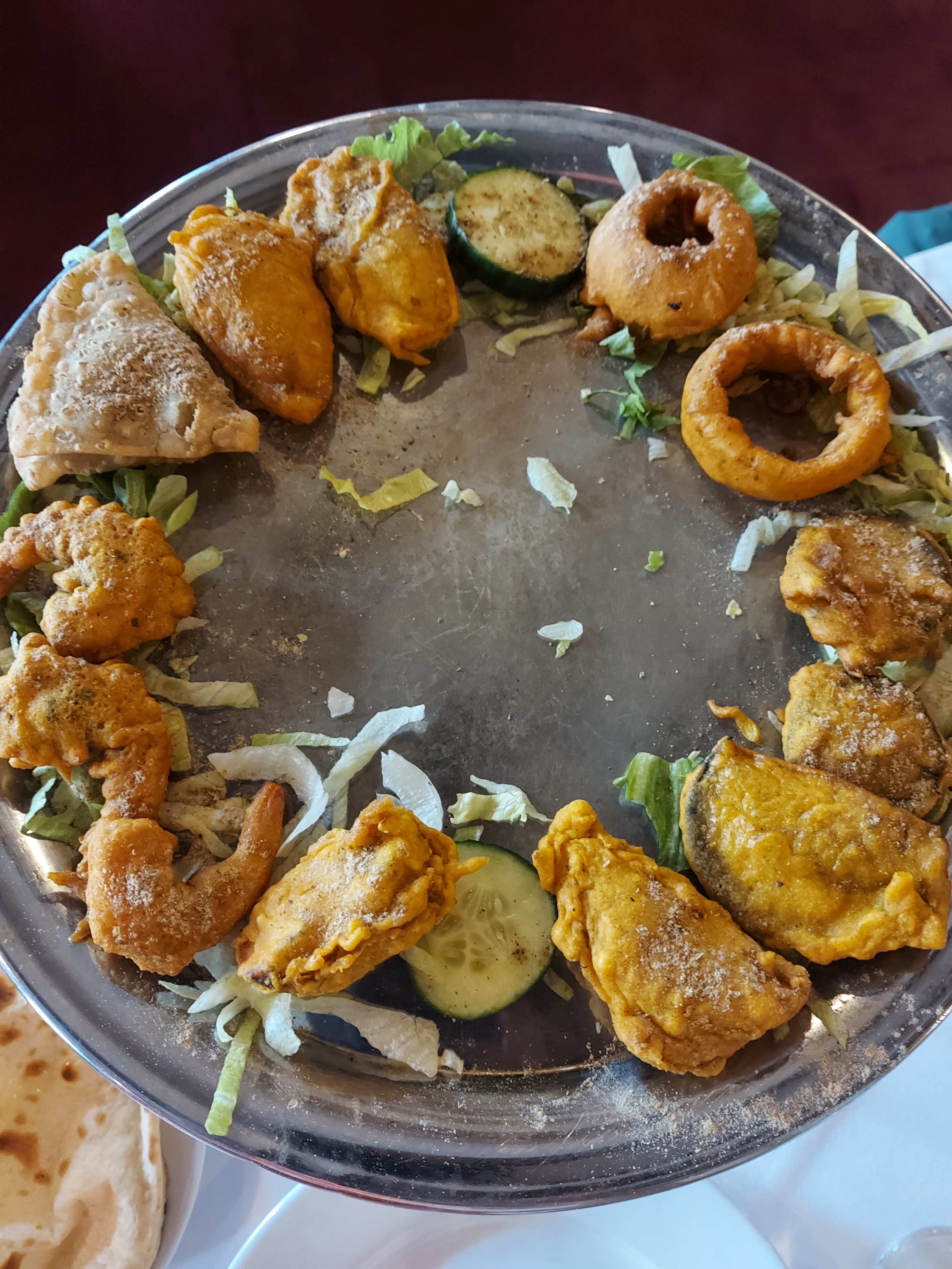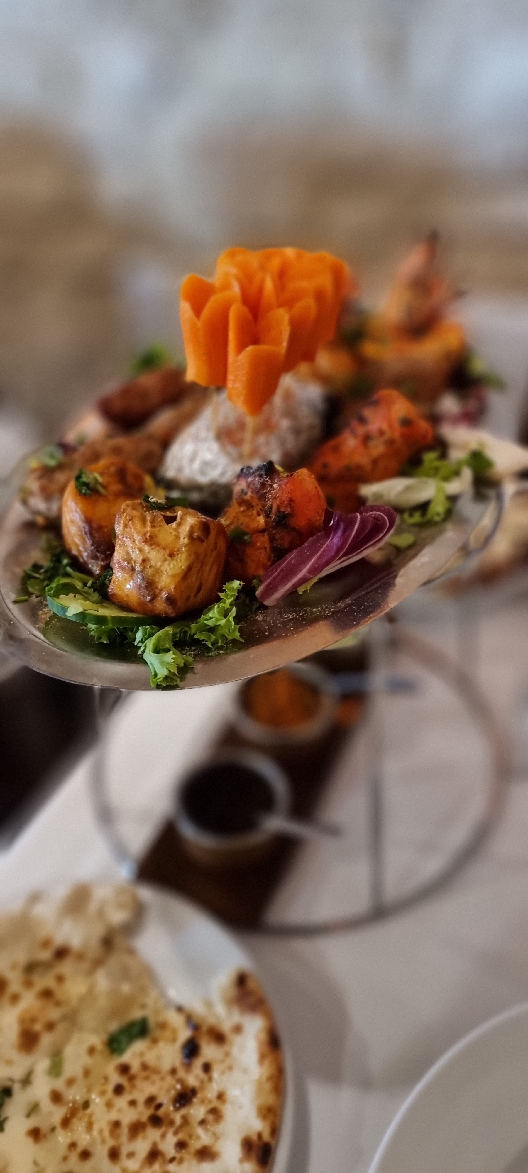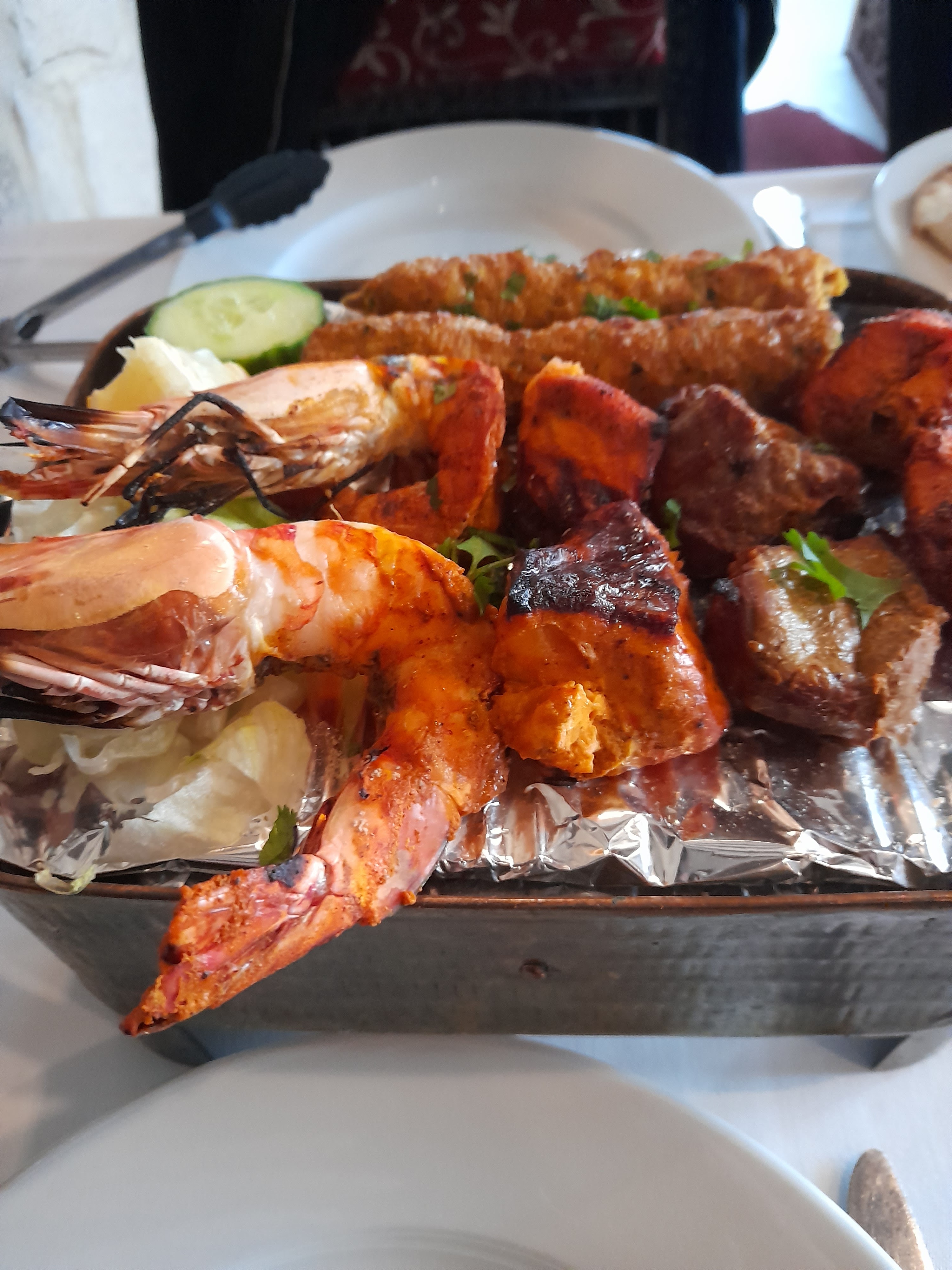 Un petit restaurant climatisé au décors soigné, belle vaisselle, beau pliage des seviettes. Un personnel très avenant et gentil. Attention, ce restaurant NE sert PAS de L'ALCOOL ! C'est la première fois que je vois cela en France. Concernant le repas, nous avons pris un assortiment de beignets de lègumes, crevettes poulet et samousas. Cet assortiment était rechauffé car pas craquant et à peine tiède. Présentation du plat était chiche. Rien au milieu, trop peu de légumes et rien au milieu, photo à l'appui. Sauces accompagnants et nan au fromage très bons. Concernant la viande, nous avons pris 2 plats d'agneau qui étaient très bons concernant les sauces mais la viande était dure. Point positif : on m'a changé mon plat et la viande était meuillere et plus tendre. En résumé : je suis un peu déçue.