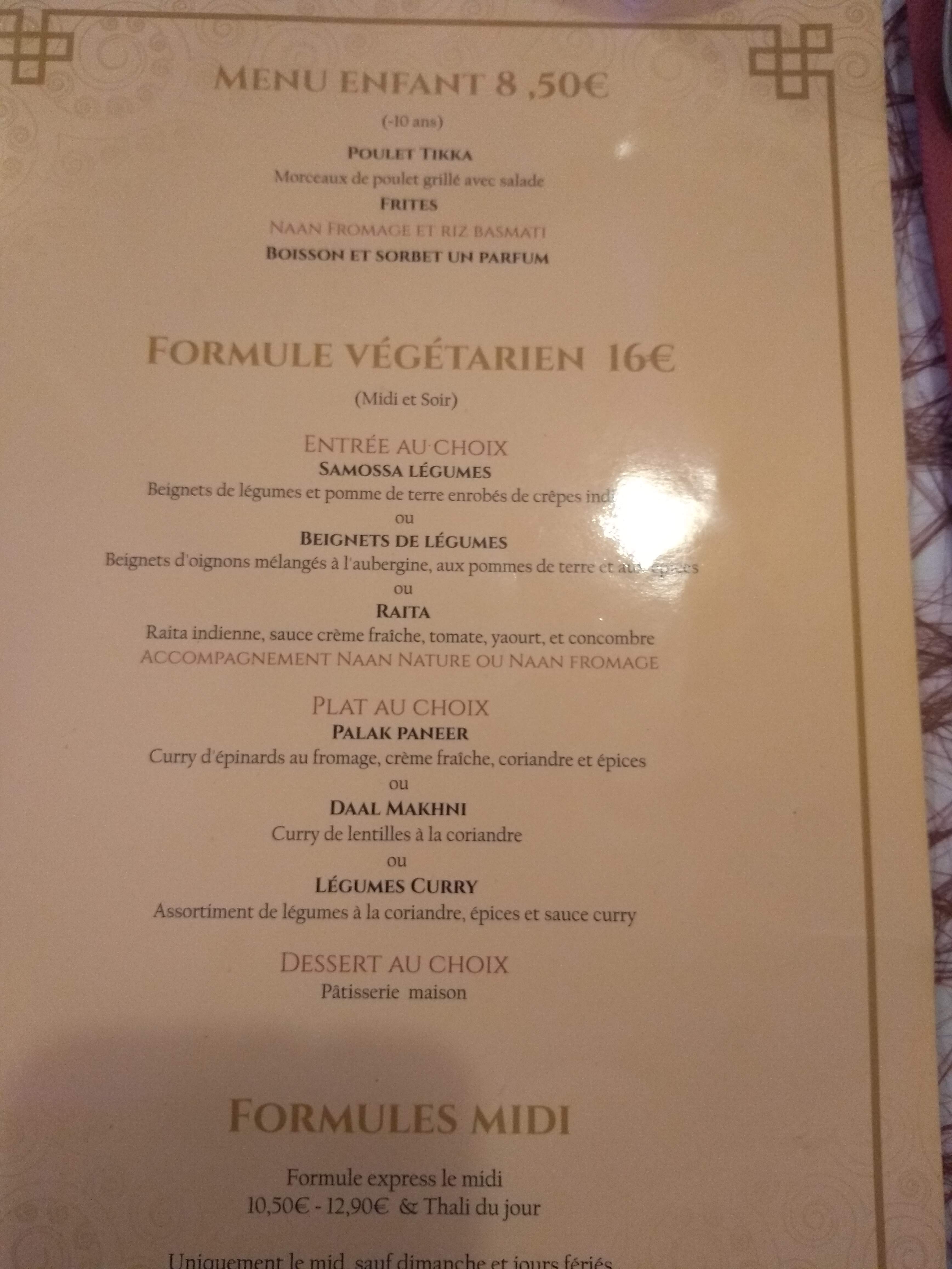 Grande déception pour ce restaurant indien situé dans le centre ville de Reims Nous avons opté pour la formule végétarienne entrée plat et dessert à 16 euros le soir L' entrée s est composée de samossas et de beignets aux légumes, en trop petites quantités et d une qualité très similaire à celle de ceux vendus en grande surface. Le nan l accompagnant était également décevant. Le plat principal etait composé d un dahl de lentilles, plutot moyen, le mix d'épices un peu fade. Le plat etait egalement peu copieux... Je passe le dessert a base de deux boules de sorbet... La decoration est typique et le personnel essaye d etre professionnel mais en resume je ne recommande pas ce restaurant
