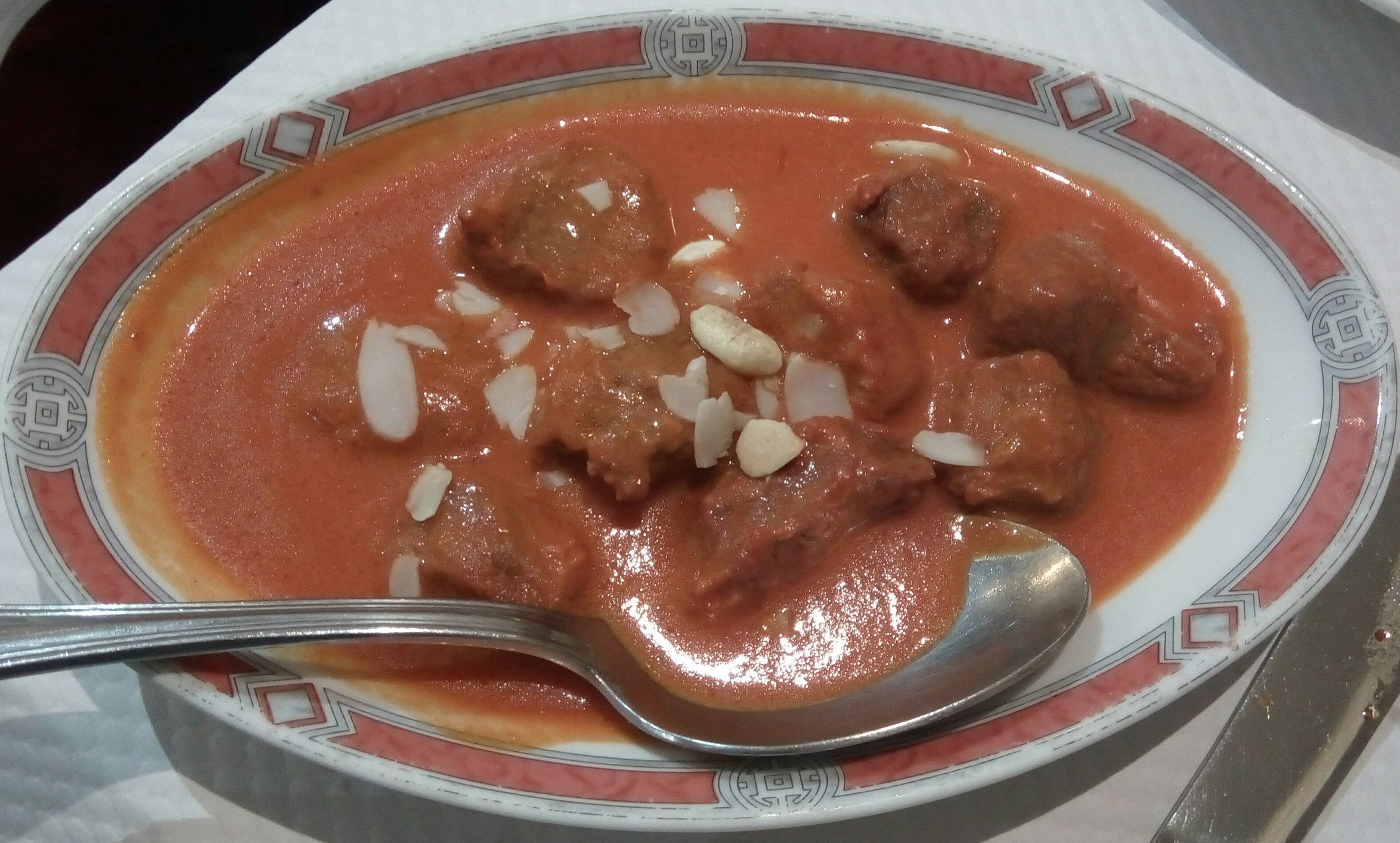 Malheureusement faible en viande. 6 petits bouts de poulet baignant dans la sauce. Sans compter la faible quantité de riz, obligé d'en commander deux fois. J'ai eu le malheur d'aller aux toilettes en début de soirée et d'avoir croisé la porte de la cuisine ouverte. Dans un état déplorable, à en hésiter de partir du restaurant Il y'a de meilleur indien comme le PunJab qui propose un buffet complet, et très bon Je ne retournerai pas ici