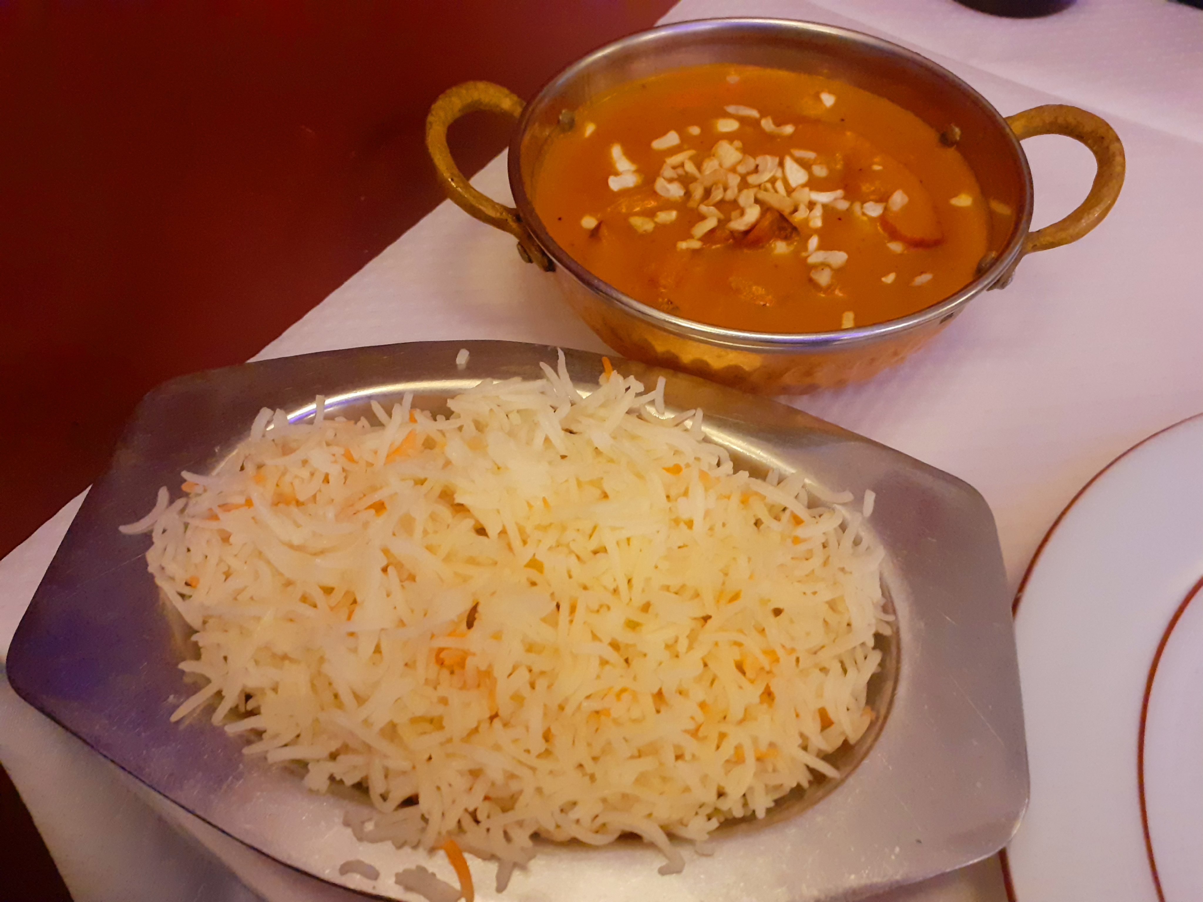Quel dommage ! Entrée samosas correct car sans doute industriel , plat liquide vaguement au curry mais surtout à la sauce tomate industrielle alors que j’avais commandé un agneau korma au curry et noix de cajou.. aucune noix ! Le riz « basmati » bien collé et avec un goût de midi voir la veille alors que c’était dimanche soir ! Une remise de 2€ pour s’excuser du plat non correspondant à la commande... bref un restaurant à oublier très vite ! Dommage dommage !