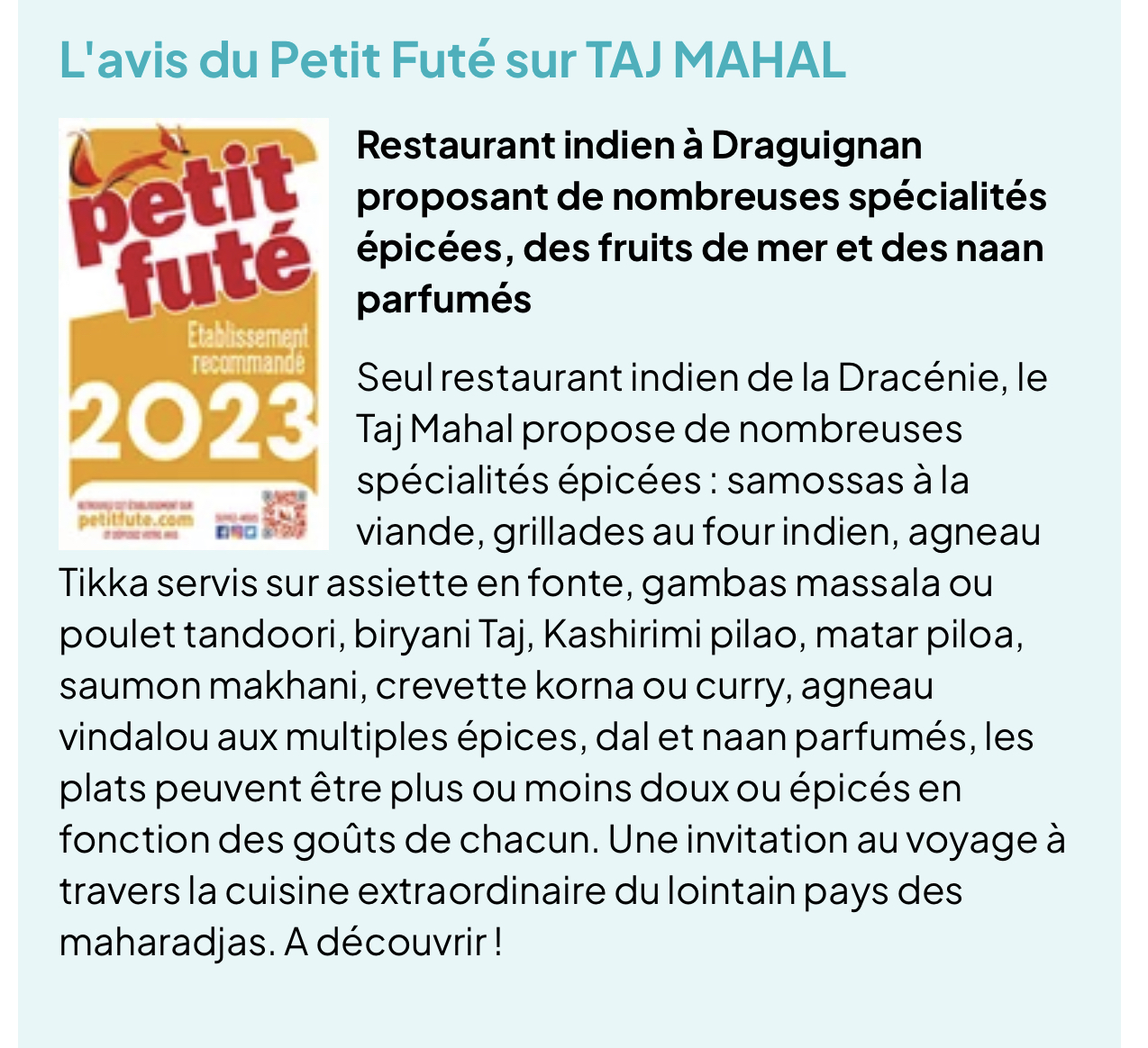 Bonjour merci pour votre post. Nous sommes heureux que vous ayez passé un bon moment culinaire dans notre restaurant Taj Mahal à Draguignan. A très bientôt