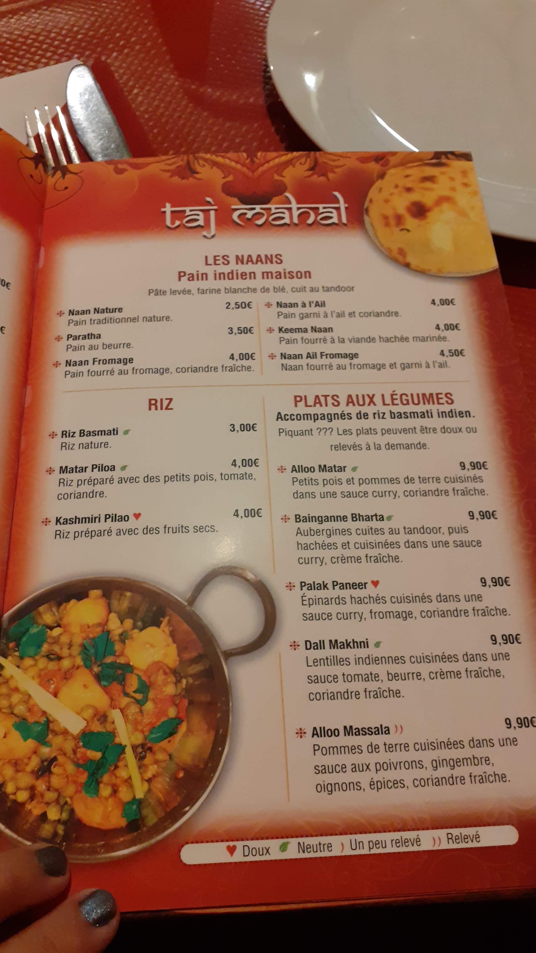 trouvé à la bonne heure sur ma promenade j'ai bien fait de rentrer au Taj Mahal accueil agréable , bien conseillé (y) vite servi très bons plat végétariens je recommande sur place ou a emporter c'est tout bon !!!