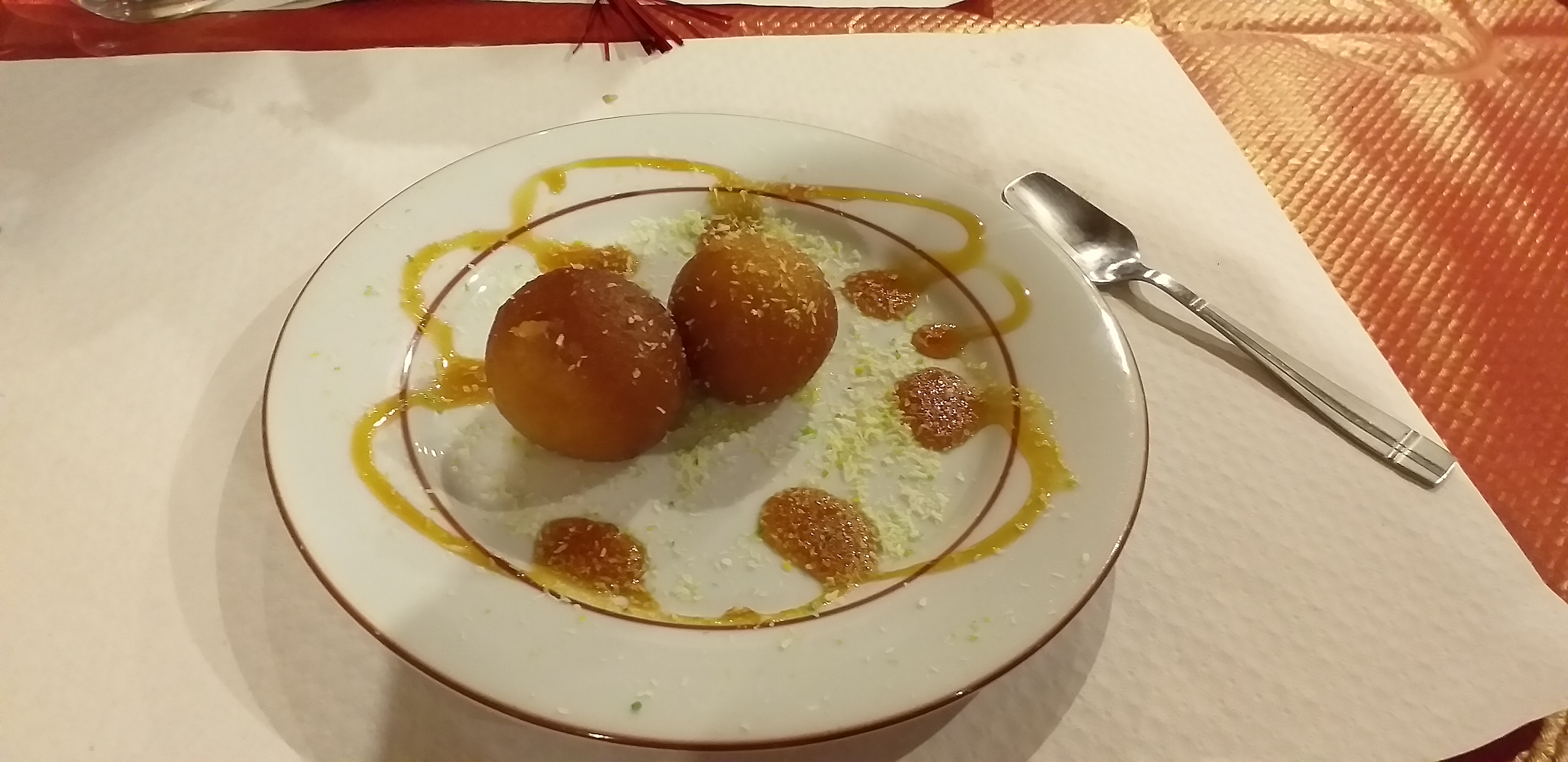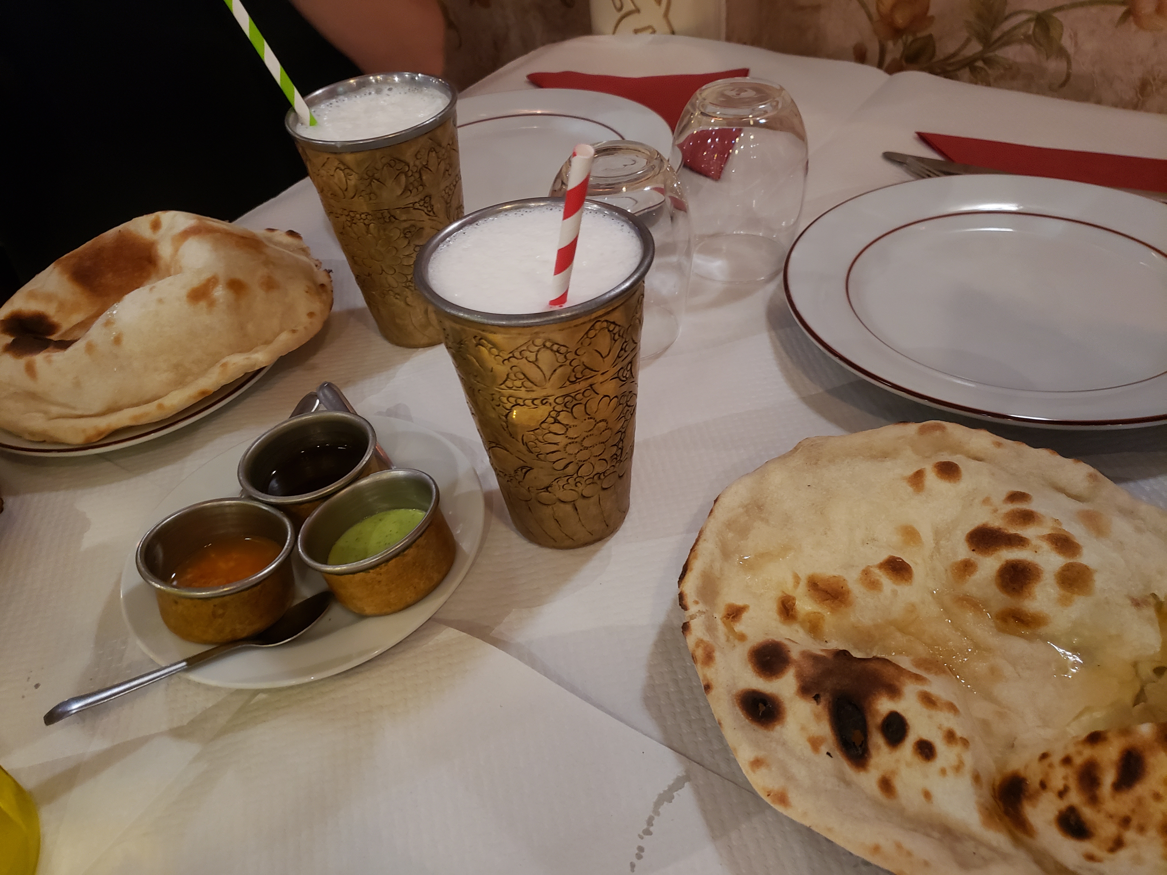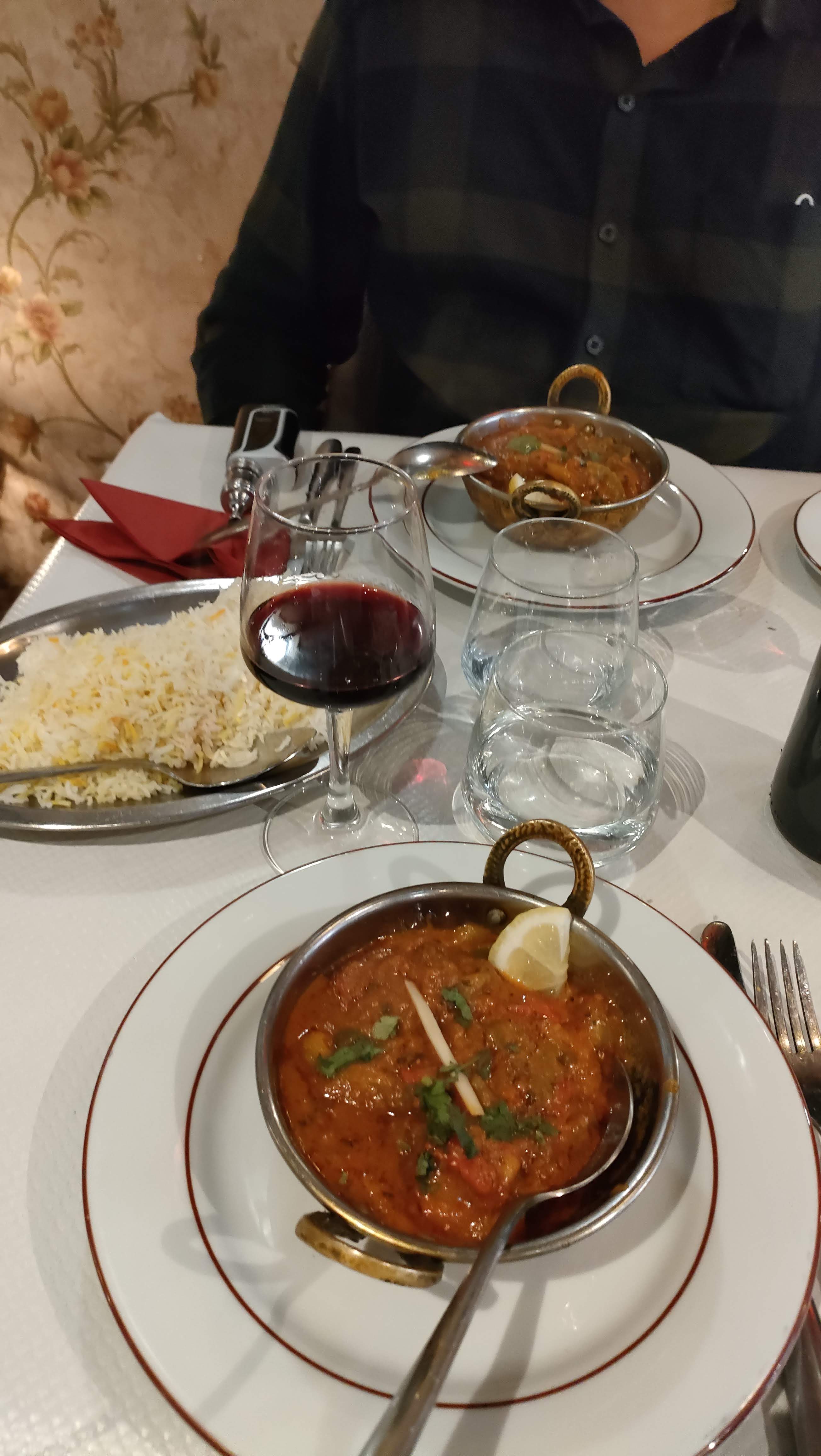 Étonnamment nous, nous avons très mal mangé. Un lassi à la rose qui n'avait du nom que la couleur. C'était un lait au sirop. Menu midi composé d'une louche de poulet sec sauce korma (les pistaches, noix de cajou faisaient la grève sauf une pauvre amande effilée) salade cantine et sauce industrielle... Une étoile pour le riz et le naan. Je suis en colère car les sorties coûtent cher, avoir donné 36€ à ce restaurant était tout simplement du gâchis.