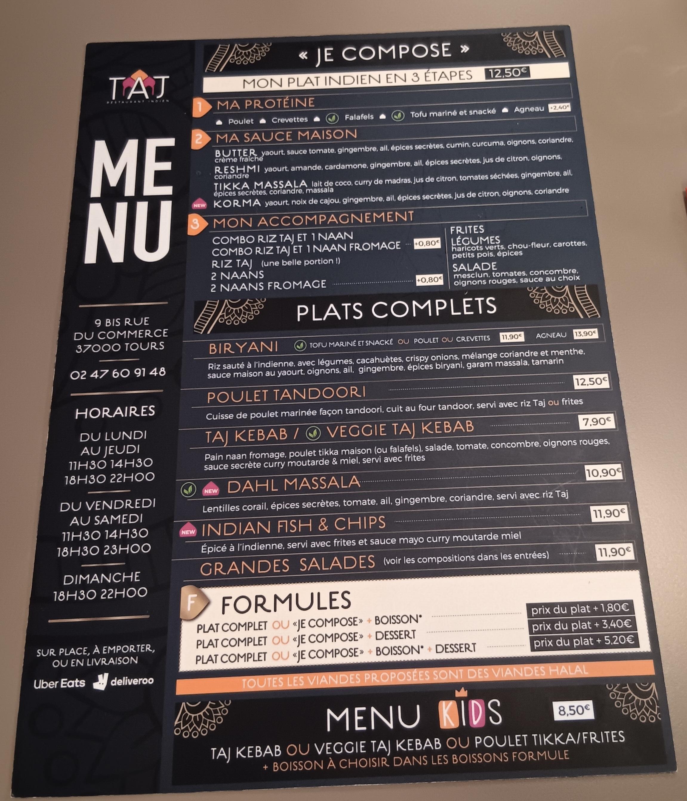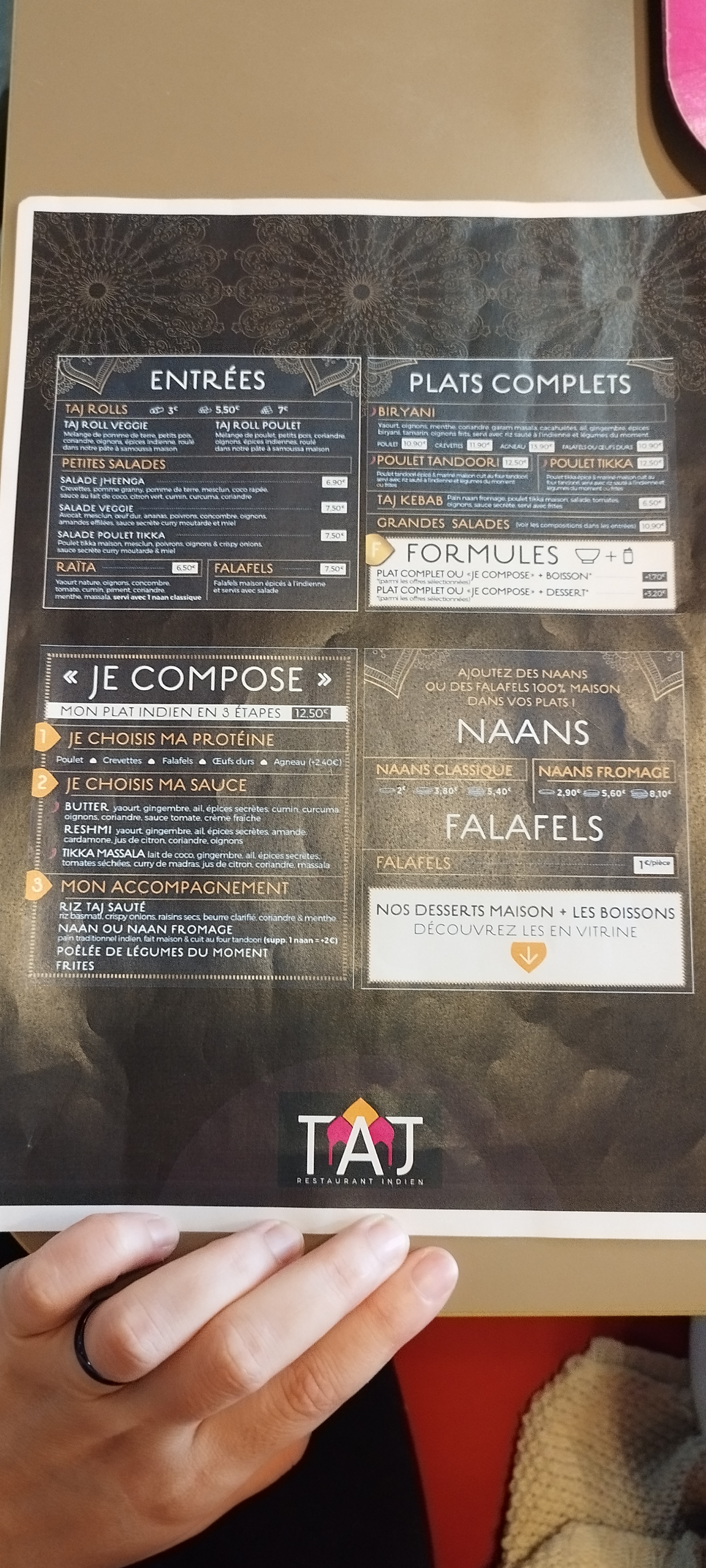 Allez y les yeux fermés ! 🥰 Venue cet été ☀️ : la formule <> au poulet est très bonne. Le poulet est moelleux. Etant fan de fromage, j'aimerais pouvoir avoir un supplément fromage à ajouter dans le Naan Fromage. Personnel agréable en salle et en cuisine ! Revenue ces derniers mois : le Taj Kebab est bien savoureux, et le poulet reste toujours moelleux dans les Taj Rolls. L'Indian Fish & Chips est savoureux et croustillant grace aux epices indiennes. J'étais etudiante donc bon rapport qualité/prix pour un restaurant indien ! 🫓