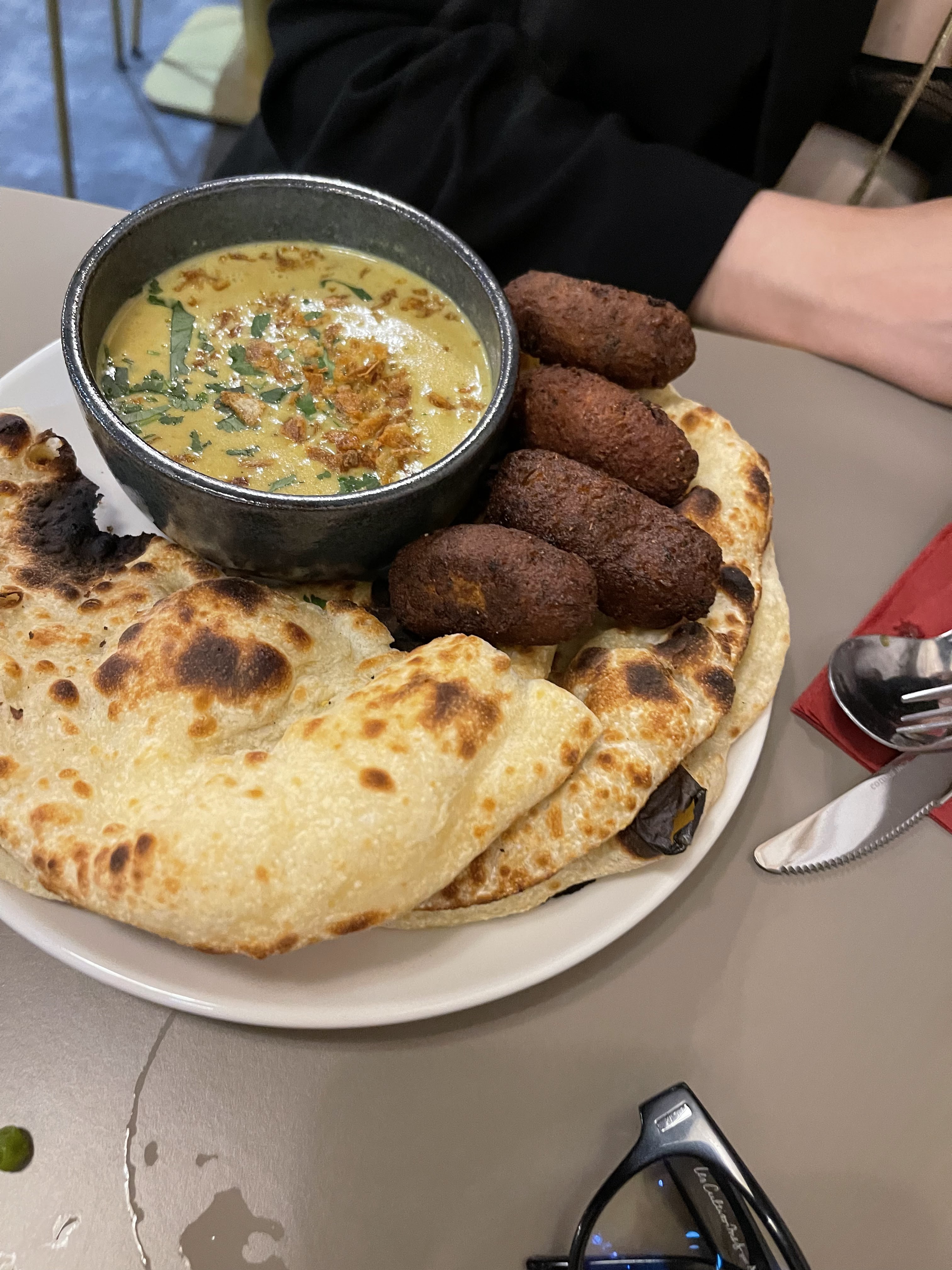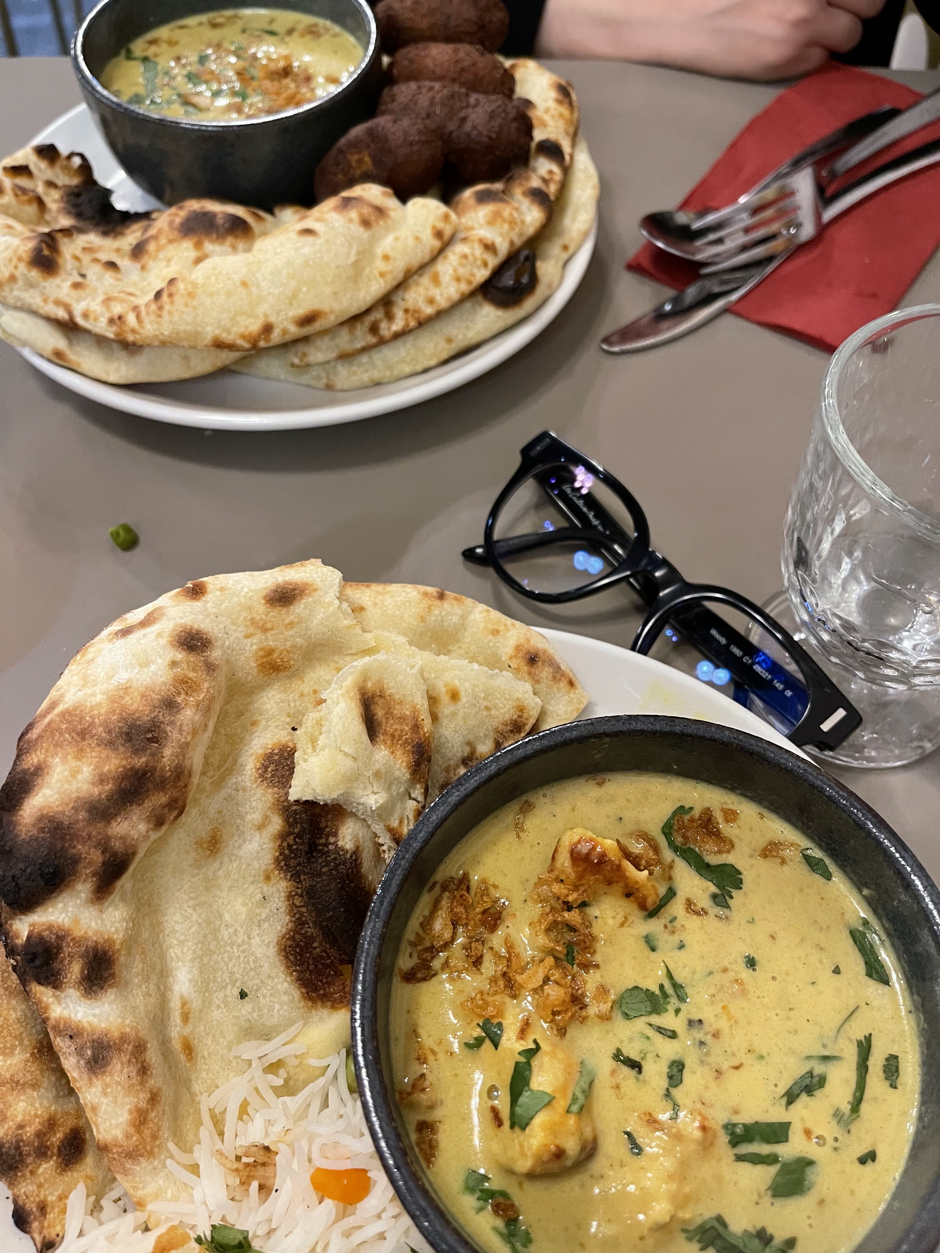 C'était un délice, j'ai pris de l'agneau le seul hic c'est que en tant que fan viande et d'agneaux, la viande n'était pas conséquente j'aurais préféré payé plus mais avoir un vrai morceau d'agneaux avec des os et tout, mais sa reste quand même délicieux, la sauce, les nans, il manquait juste ce petit détails pour que ce soit parfait, je le recommande pour la découverte des saveurs parce qu'il est beau d'explorer le monde culinaire. et pour le prix ce n'est pas exorbitants apprenner à dépenser de l'argent pour les bonnes choses c'est important.