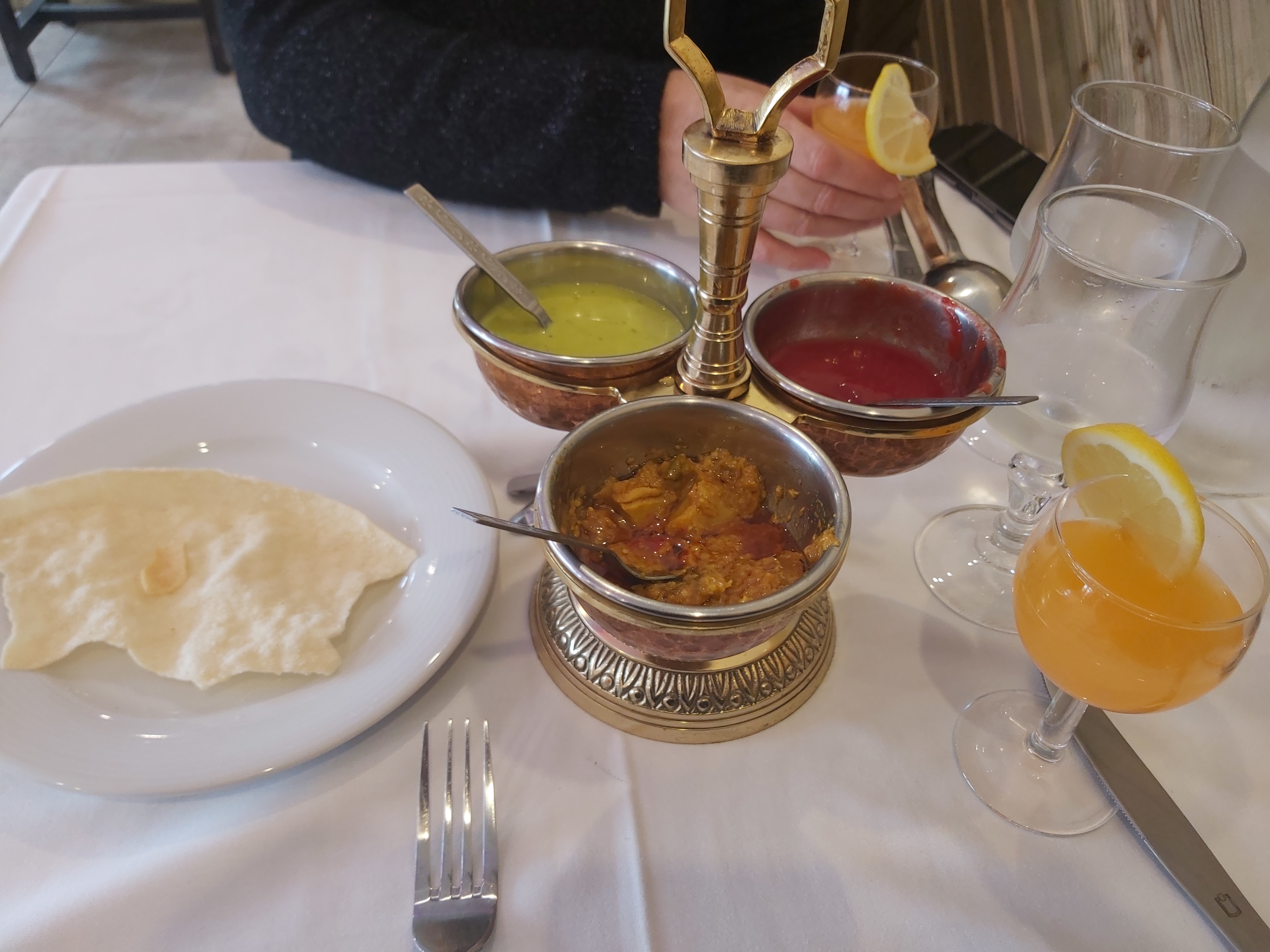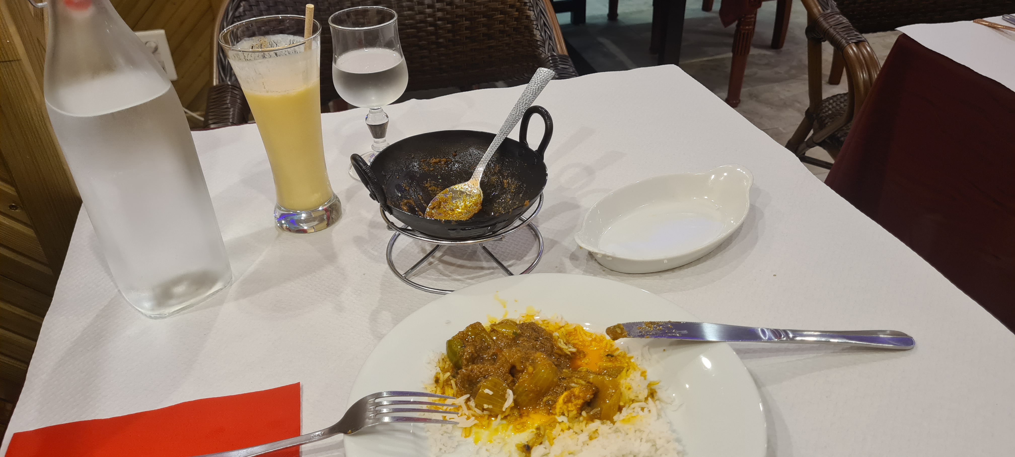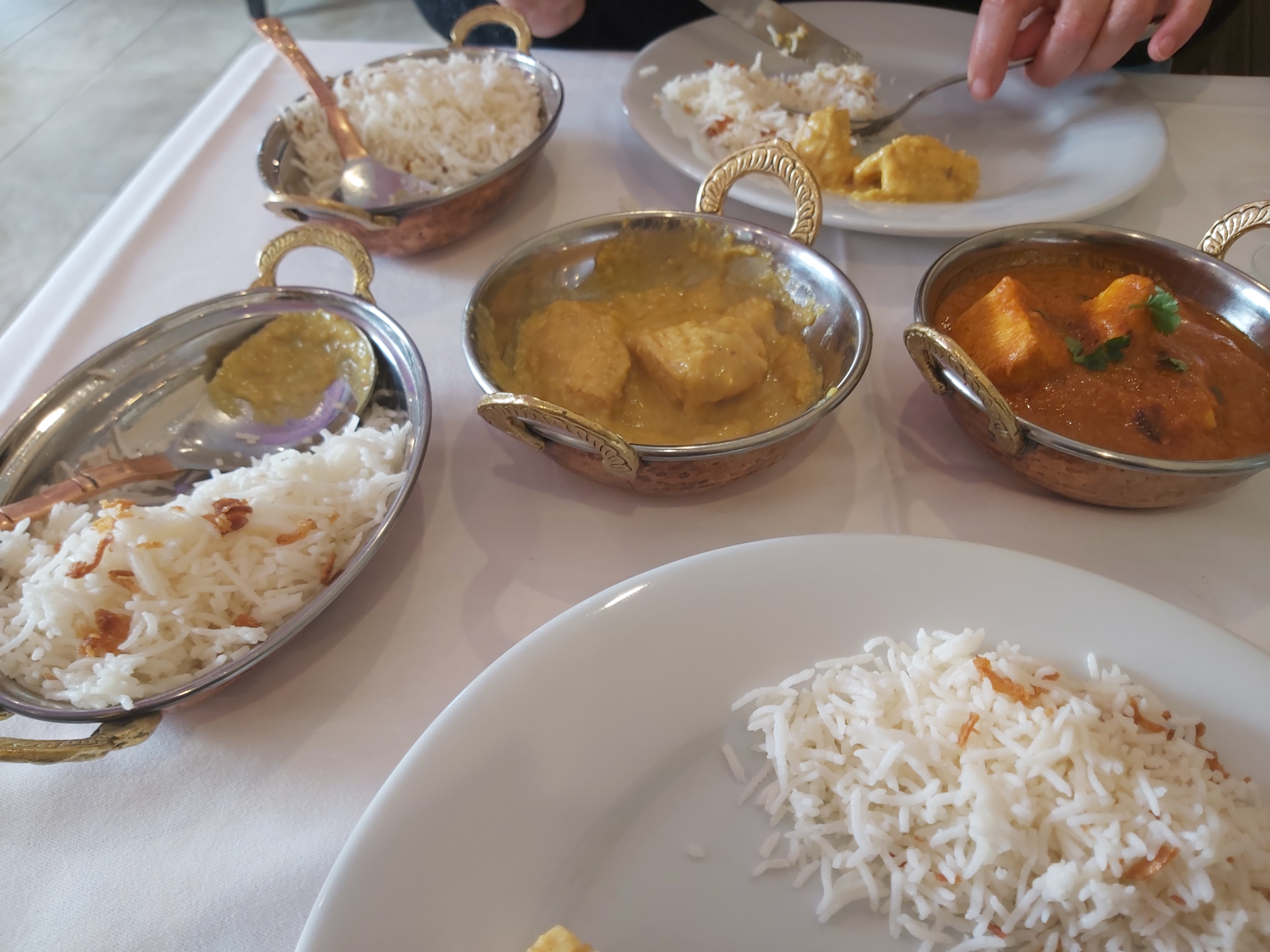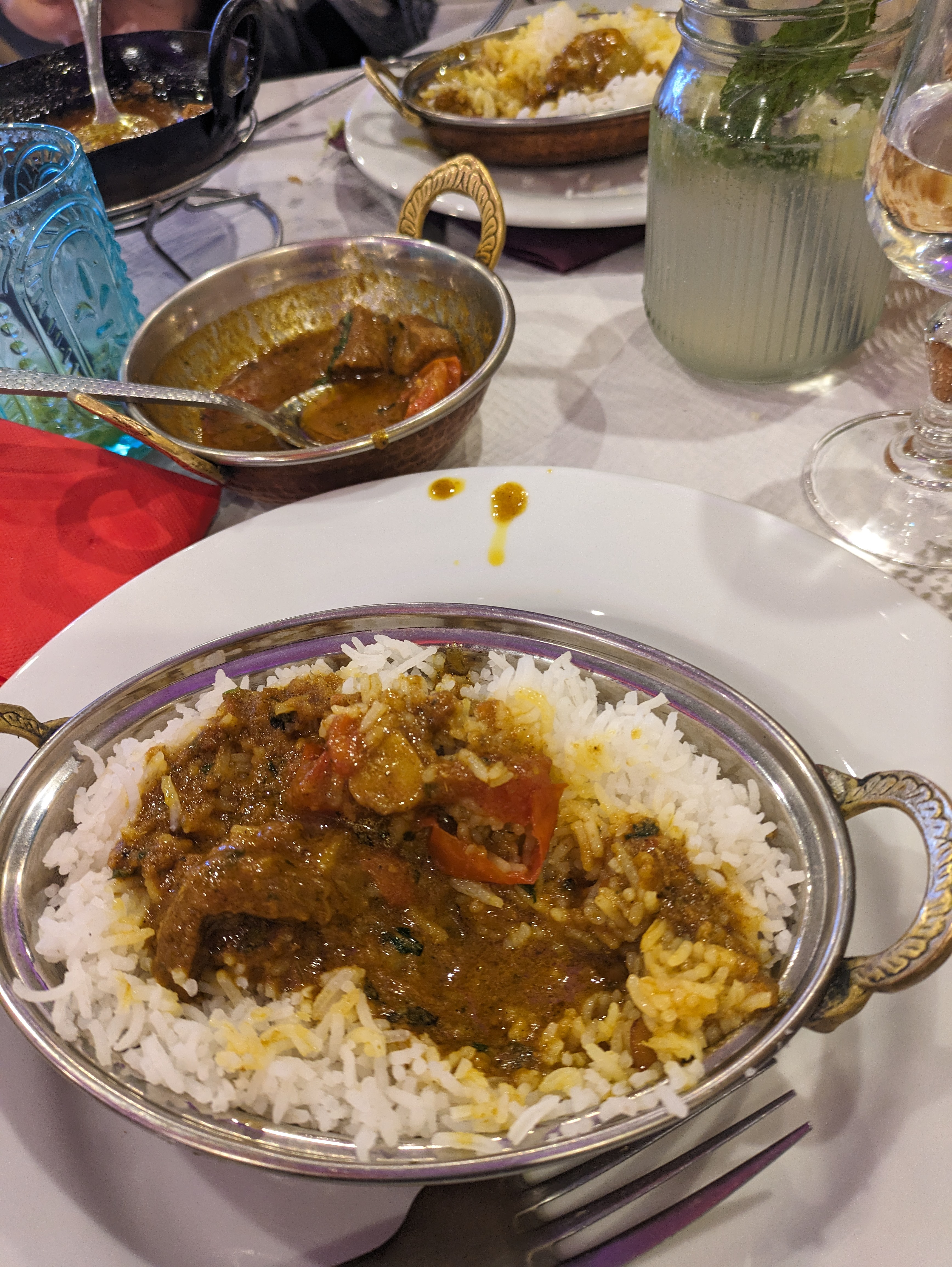Table sale (déjà servie) tâche et miettes. Entrées très bonnes mais pas servi l entrée demandée. Gambas pas très bon, le patron se plie en quatre et remet des crevettes curry. Sauce délicieuse mais crevettes pas cuites et croquantes. Byriani moyen. Nous n y retournerons pas malgré un patron sympa 1er resto indien où il n y a pas d alcool. Dommage.