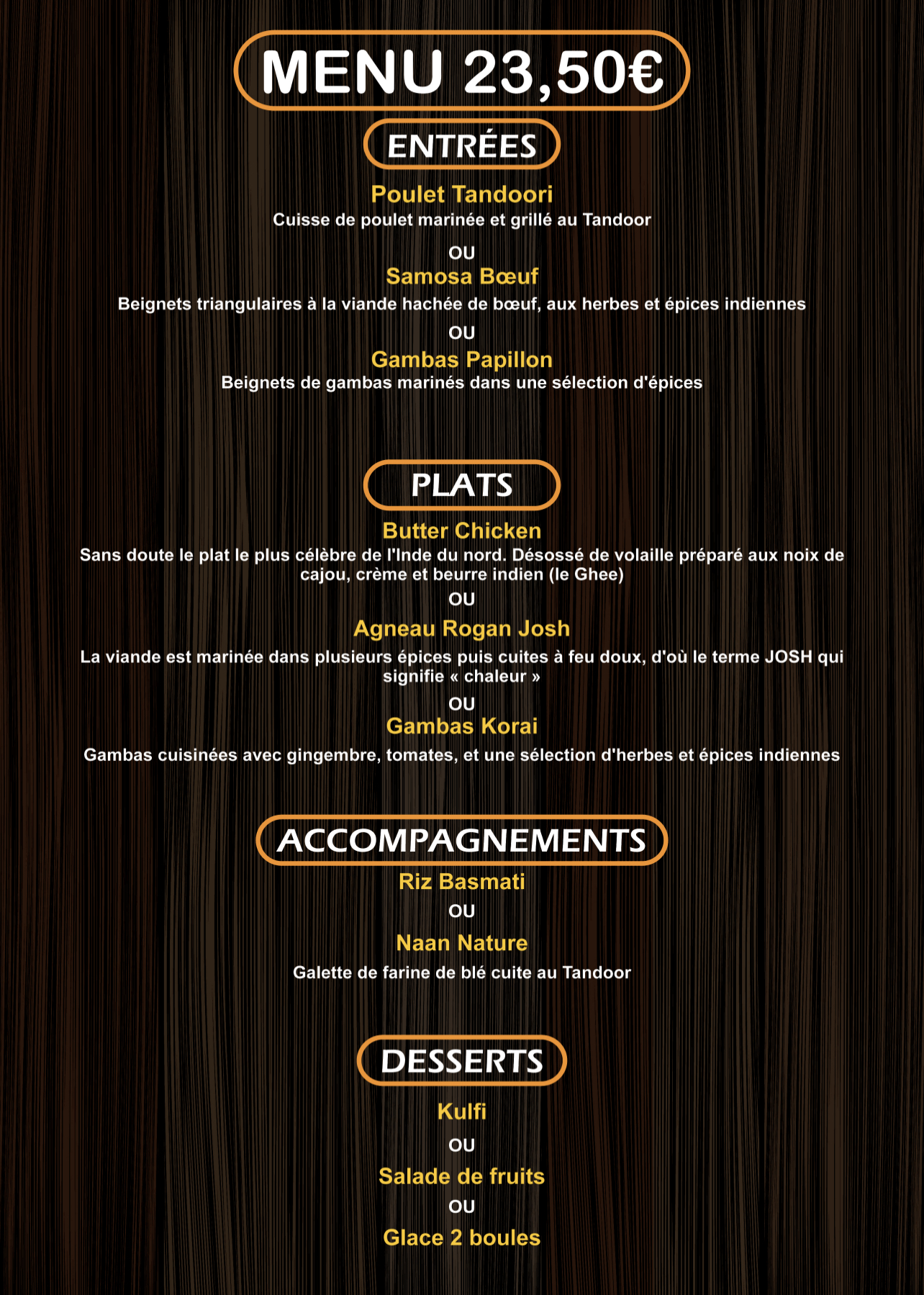 Très bon accueil, la cuisine est excellente. Nous avons pris assortiment le Shaad en entrée puis poulet Kashmiri et agneau madras accompagné de riz, naan fromage et à l'ail. Dessert lassi Mangue