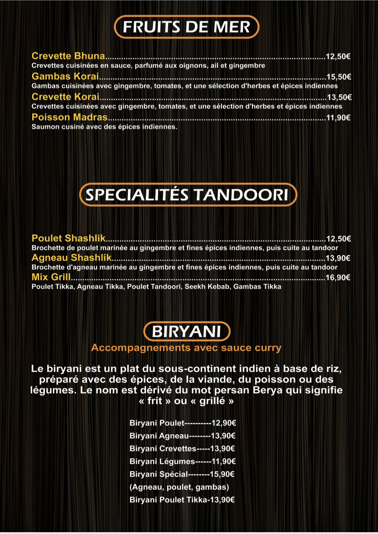 Très belle découverte. Mieux vaut tard que jamais. La salle de restaurant est superbement décorée. L'accueil est très soigné, authentique et la présentation de chaque plat judicieusement disposée de manière professionnelle. Le service est rapide compte tenu de la complexité des préparations. Les samousas légumes sont délicieusement garnis et accompagnés d'une salade verte découpées et savamment assaisonnée. La boisson sans alcool fait oublier l'absence de vin grâce aux parfums de menthe et de citron vert frais. En plat principal nous avons choisi un biriyani végétarien et un biriyani crevettes tous deux présentés dans des plats traditionnels magnifiques. Le dosage des épices est parfait c'est un festival pour les papilles dès lors qu'on sait apprécier la vraie cuisine. J'oubliai un détail : les portions sont copieuses et nous avons pu savourer les restes de biriyani le soir même pour notre plus grand plaisir. En dessert le gâteau de semoule au coulis de mangue et le lassi nous ont également conquis d'autant plus que pour un budget d'environ 60 € pour deux personnes le rapport qualité prix est excellent. Dépaysement garanti. A refaire.