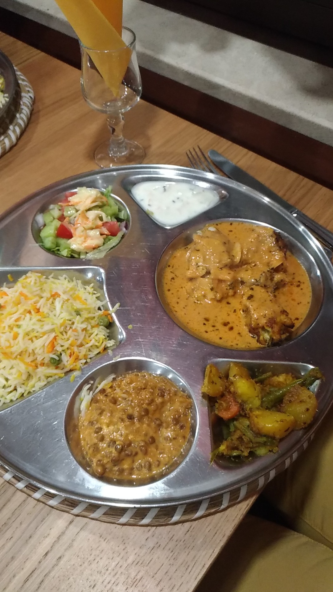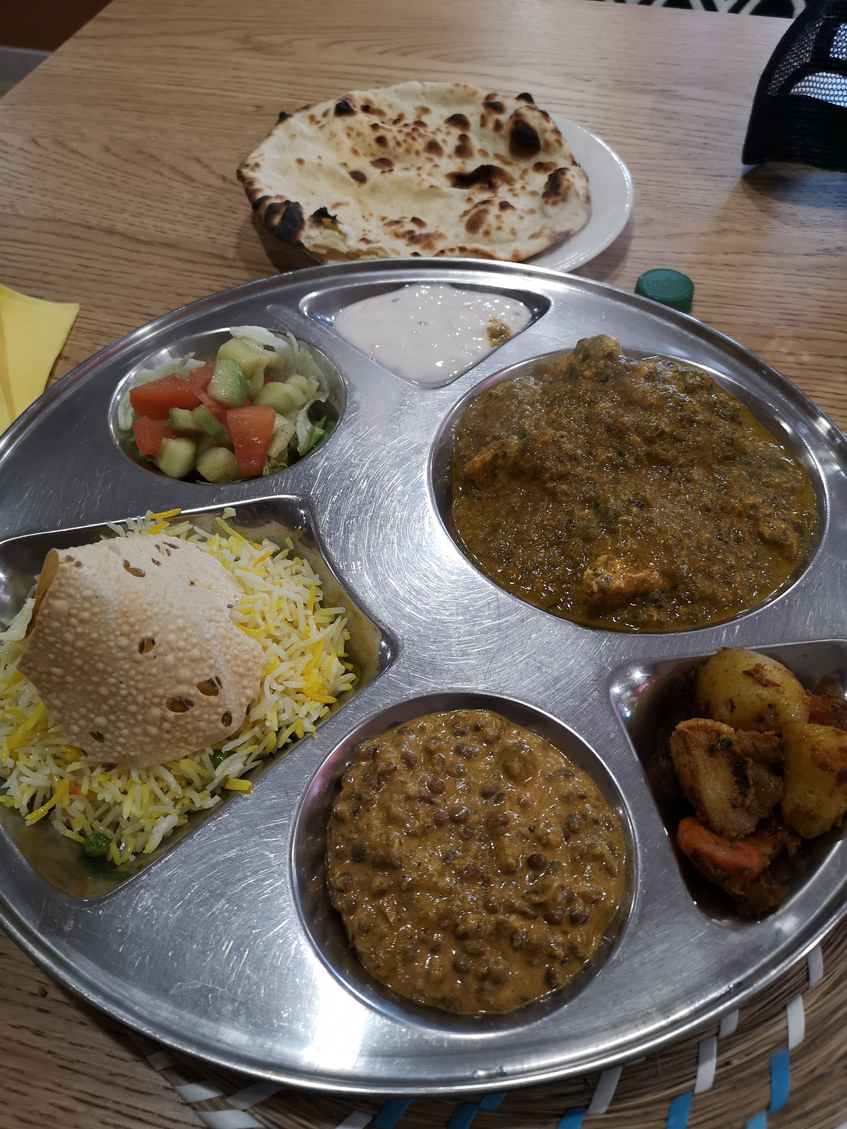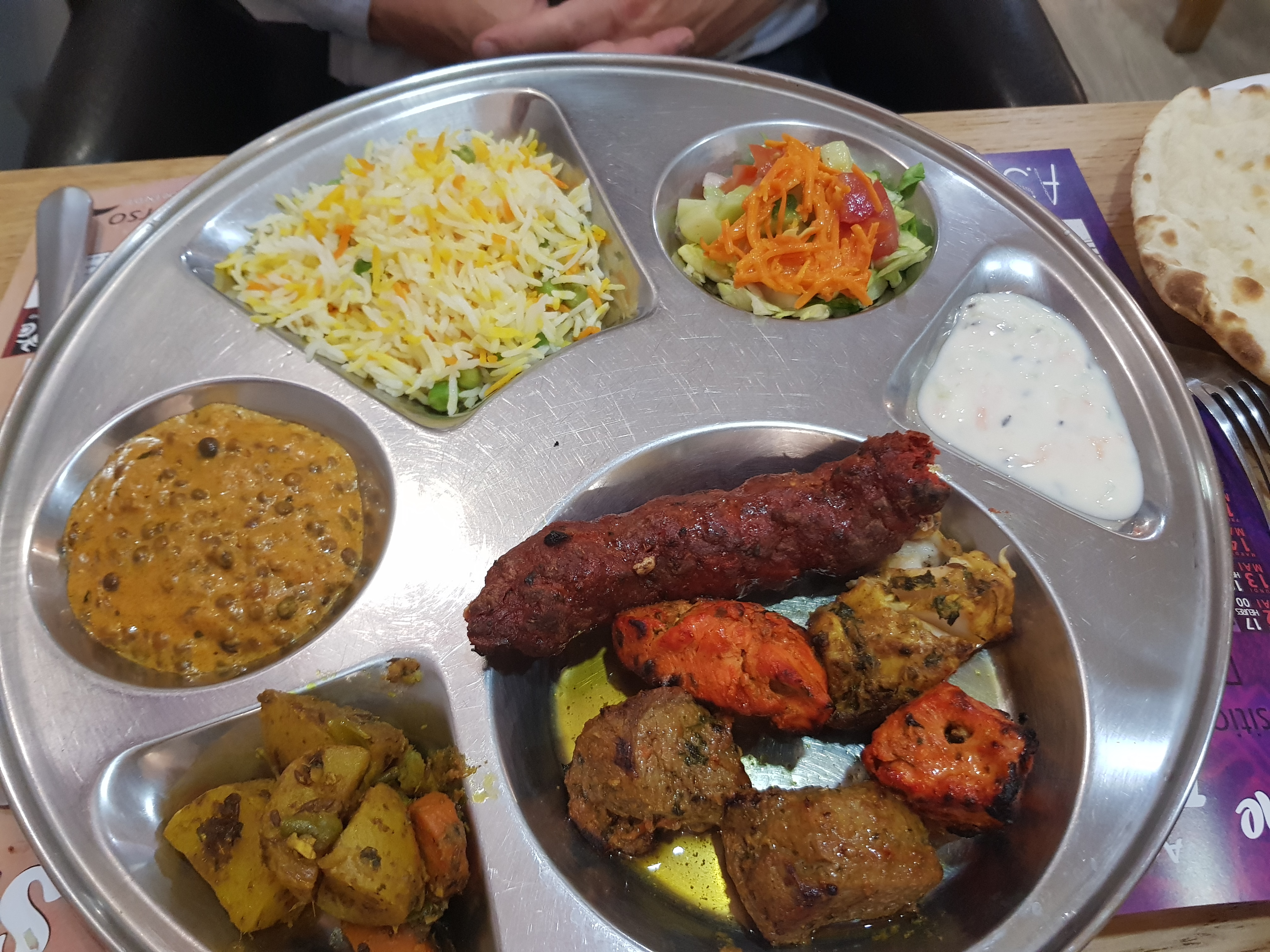 Très bon très copieux. Les plats sont servis avec toutes les garnitures riz. Pomme de terre. Dal. Crudités. C est super ! Bravo