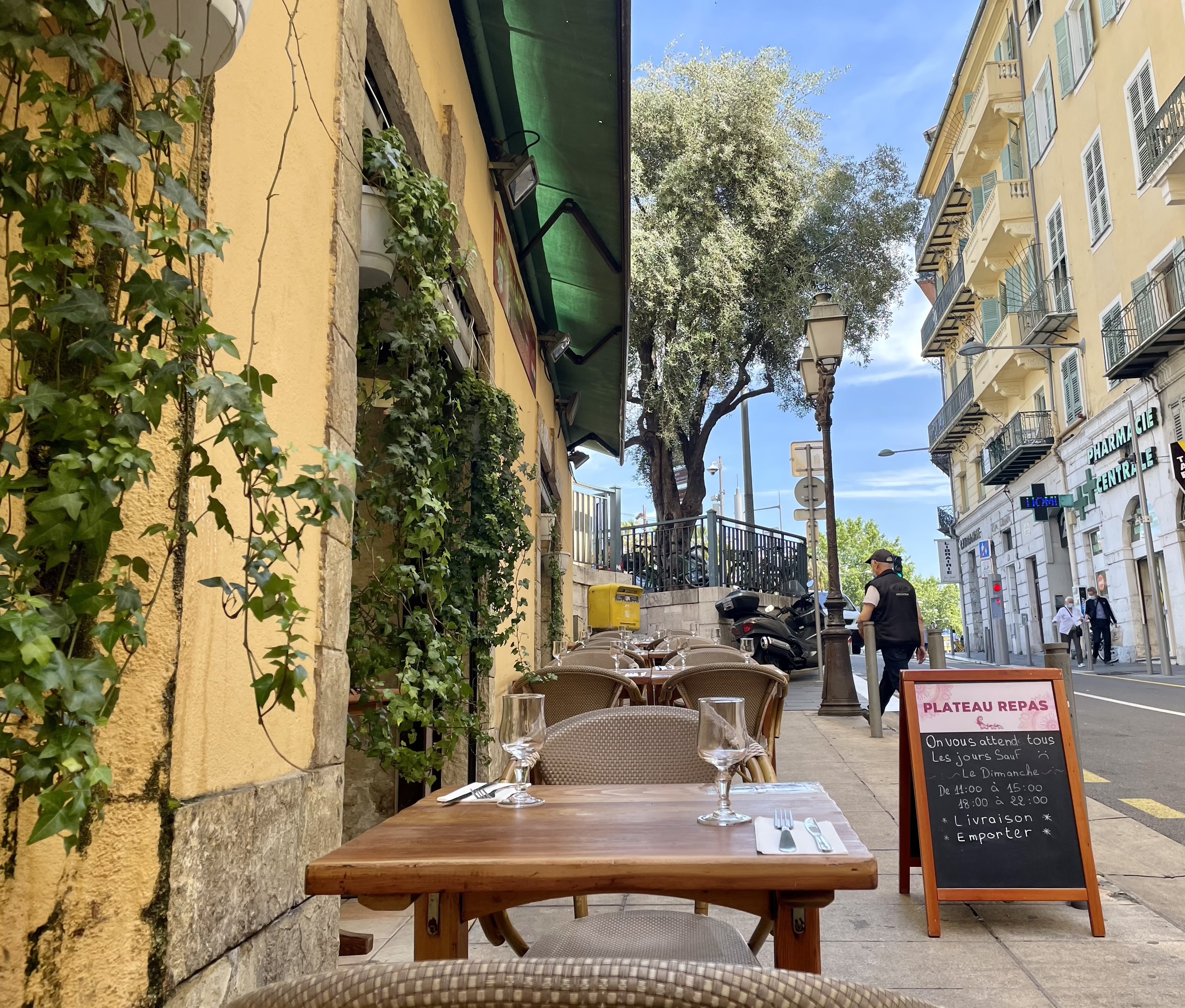 Ambiance à la fois sereine et décontractée dans un cadre agréable (la voûte du plafond et les ustensiles en cuivre rajoutent une note chaleureuse). Le personnel est toujours accueillant et serviable. La nourriture qui est servie est toujours bonne et en quantité suffisante. Comme pour tous les restaurants du centre de Nice, il est évident qu’il vaut mieux venir en tram ou à pied car il sera difficile de trouver une place de parking à proximité.