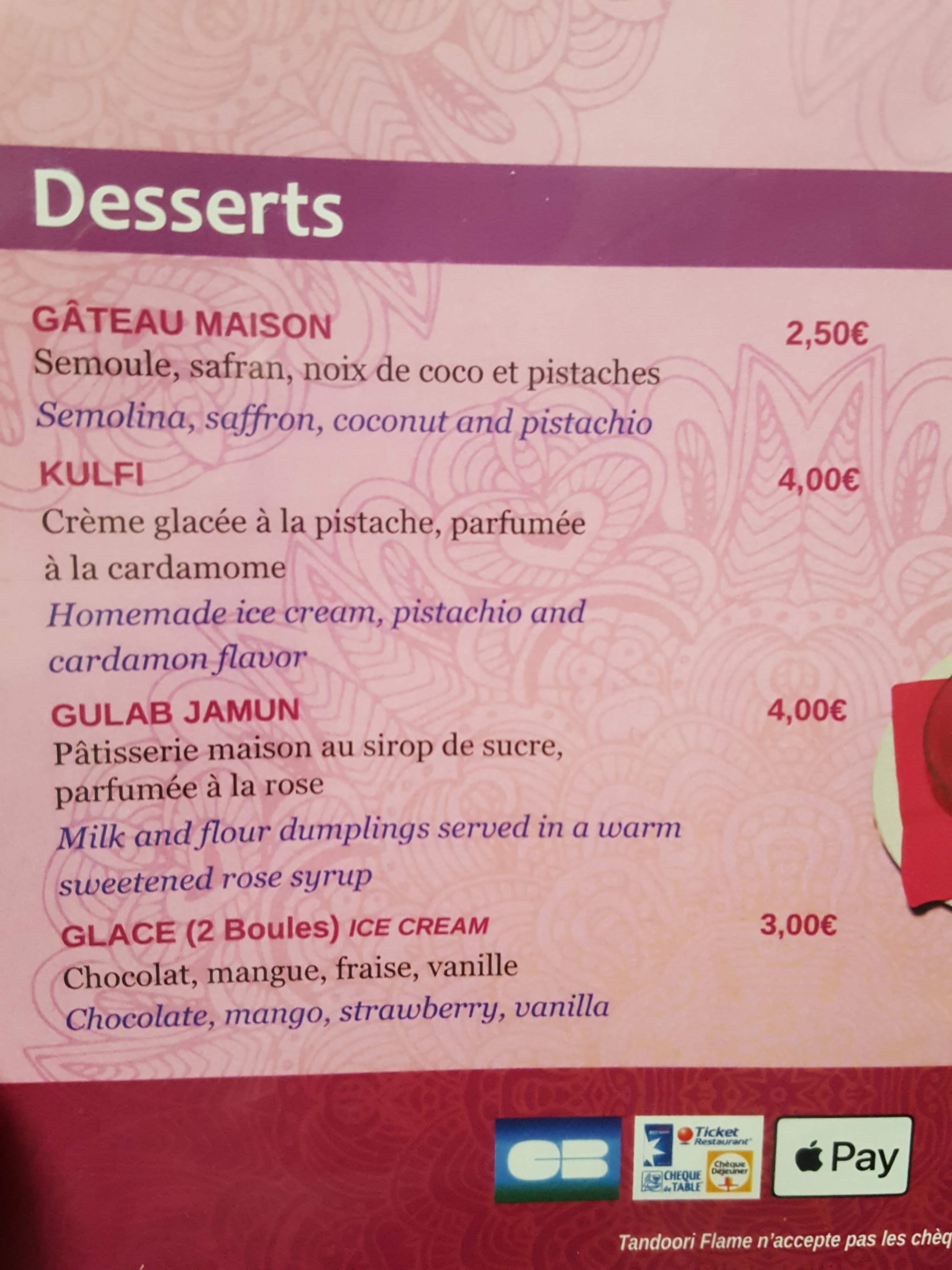 Excellent ! On cherchait un restau (6 pers.) et on a choisi le Tandoori Flame au vu des notes laissée sur Google. Eh bien, on n'a pas été déçu... Les prix sont corrects et la serveuse très gentille. Elle m'a même offert de quoi apaiser le feu dans mon corps après que j'ai confondu les sauces sucrée et pimentée à étaler sur les cheese nan ! Je recommande vivement.