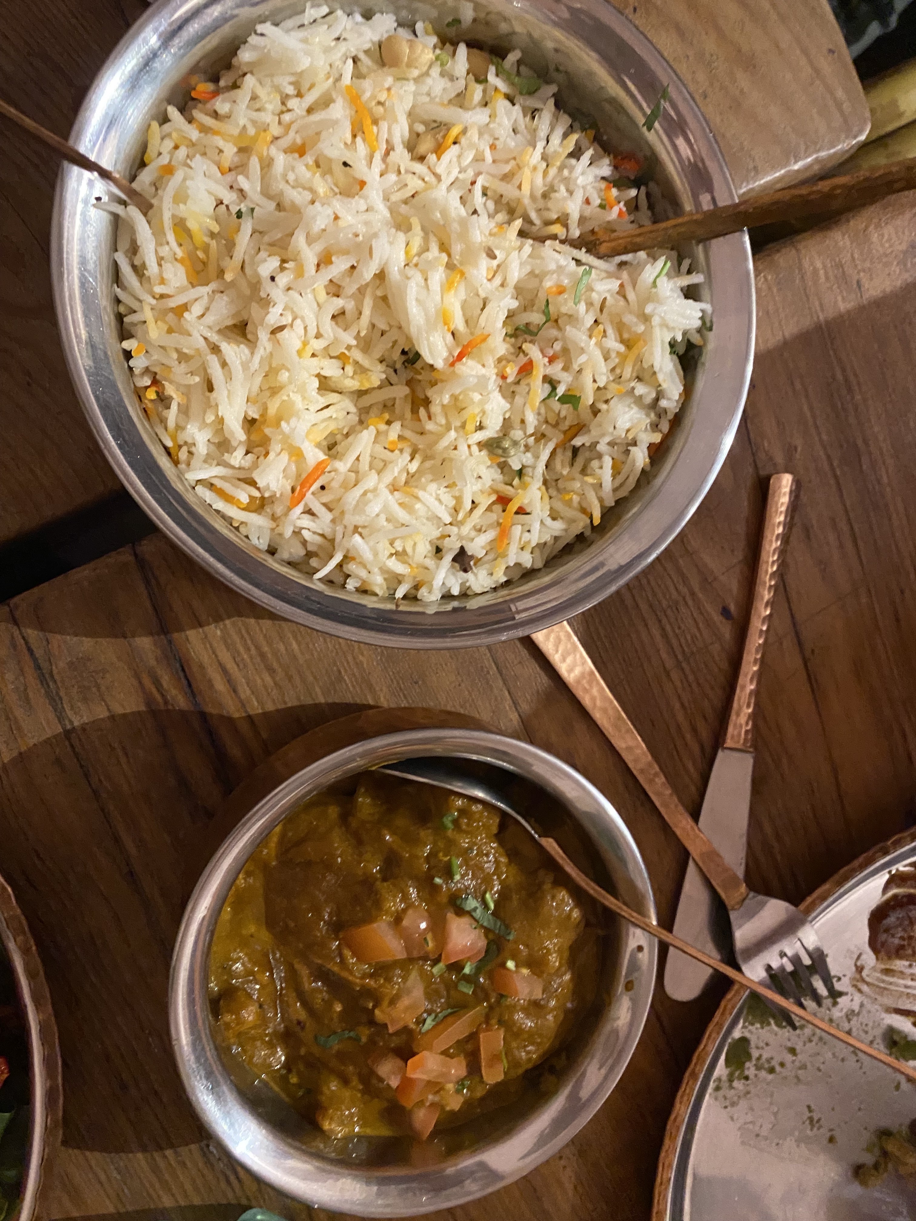 - Sur les deux plats que nous avons commandé l'un était plus épicé donc meilleur, l'autre n'avait pas trop de goût. - un peu cher, le riz n'est pas compris avec les curry... + le naan oignon est très bon
