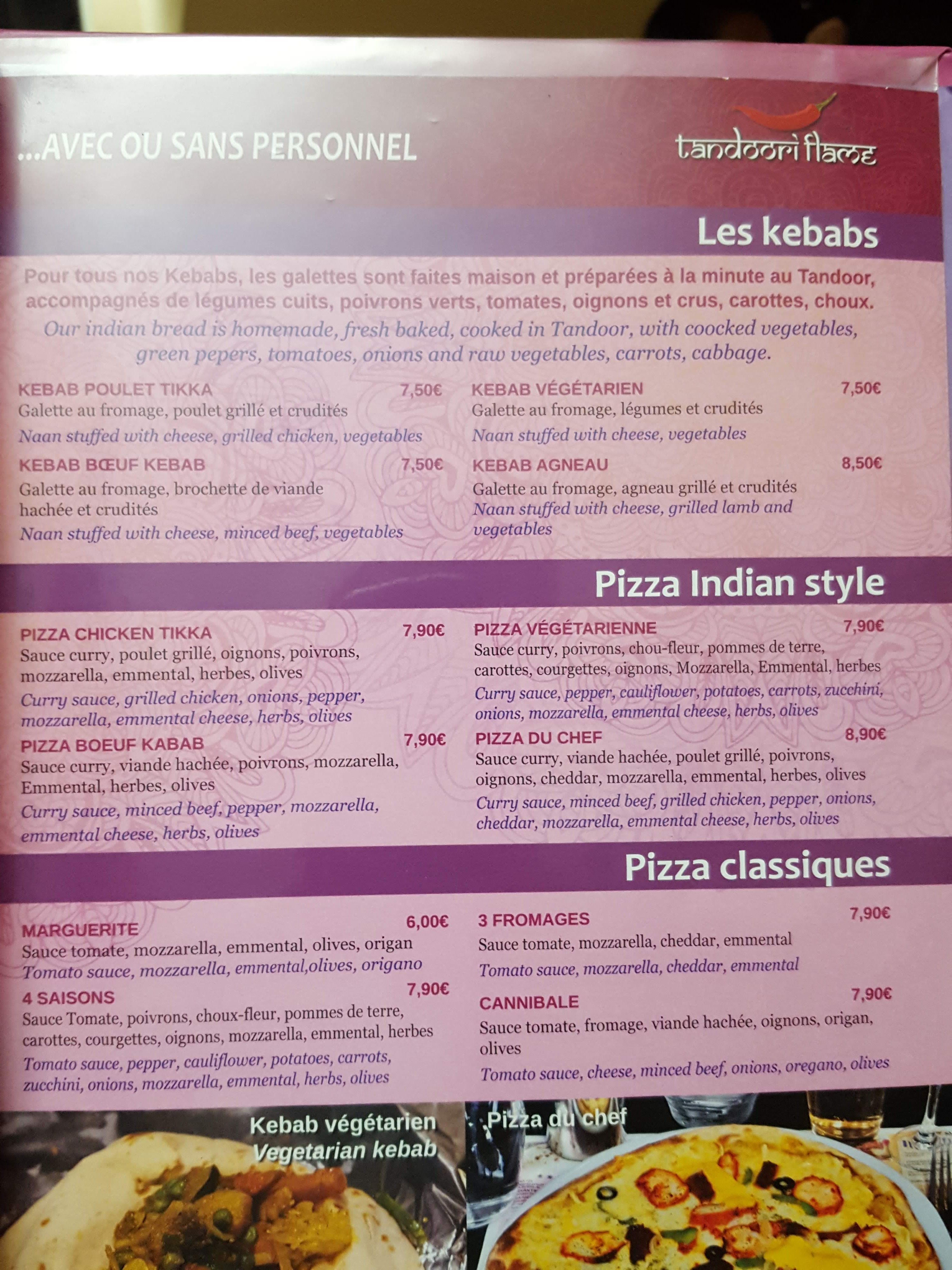 Nous étions de passage à Nice et cherchions où dîner. La difficulté étant de trouver des restos hallal sauf snack/ kebab/burgers/tacos... Nous avons vu le tandoori flames relativement bien évalué et avons donc voulu tester. Le restaurant est bien situé en haut d'une petite ruelle qui mène dans les rues piétonnes animées de la ville. Nous n avons pas réservé mais avons rapidement été installés. Il y a quelques tables en extérieur et une grande salle intérieure .La serveuse nous apporte les menus. La prise de commandes suit rapidement en revanche le service à été très long. Plus de 30 minutes d'attente... Nous avions le temps puisque nous étions en vacances mais nous espérions surtout que la qualité du repas serait à la hauteur de cette attente. Nos plats sont enfin arrivés. Sachez que les viandes sont servies sans accompagnement donc pensez à commander du riz ou des naans. Les portions sont généreuses, les mets sont bien chauds. En entrée nous avons opté pour les beignets d'oignons aux pois chiches. Servis avec une sauce romarin et menthe. C'était un beau mariage de saveurs ! Pour les plats le riz simple et un poulet tandoori et le riz aux fruits secs et confits avec du poulet aux noix de cajou. La viande etait tendre et bien imprégnée des épices. La cuisson du riz était top ! Seul bémol: le lassi a la rose. Pas crémeux du tout, goût de rose a peine perceptible et trop de glaçons... L'accueil et le staff sont agréables.