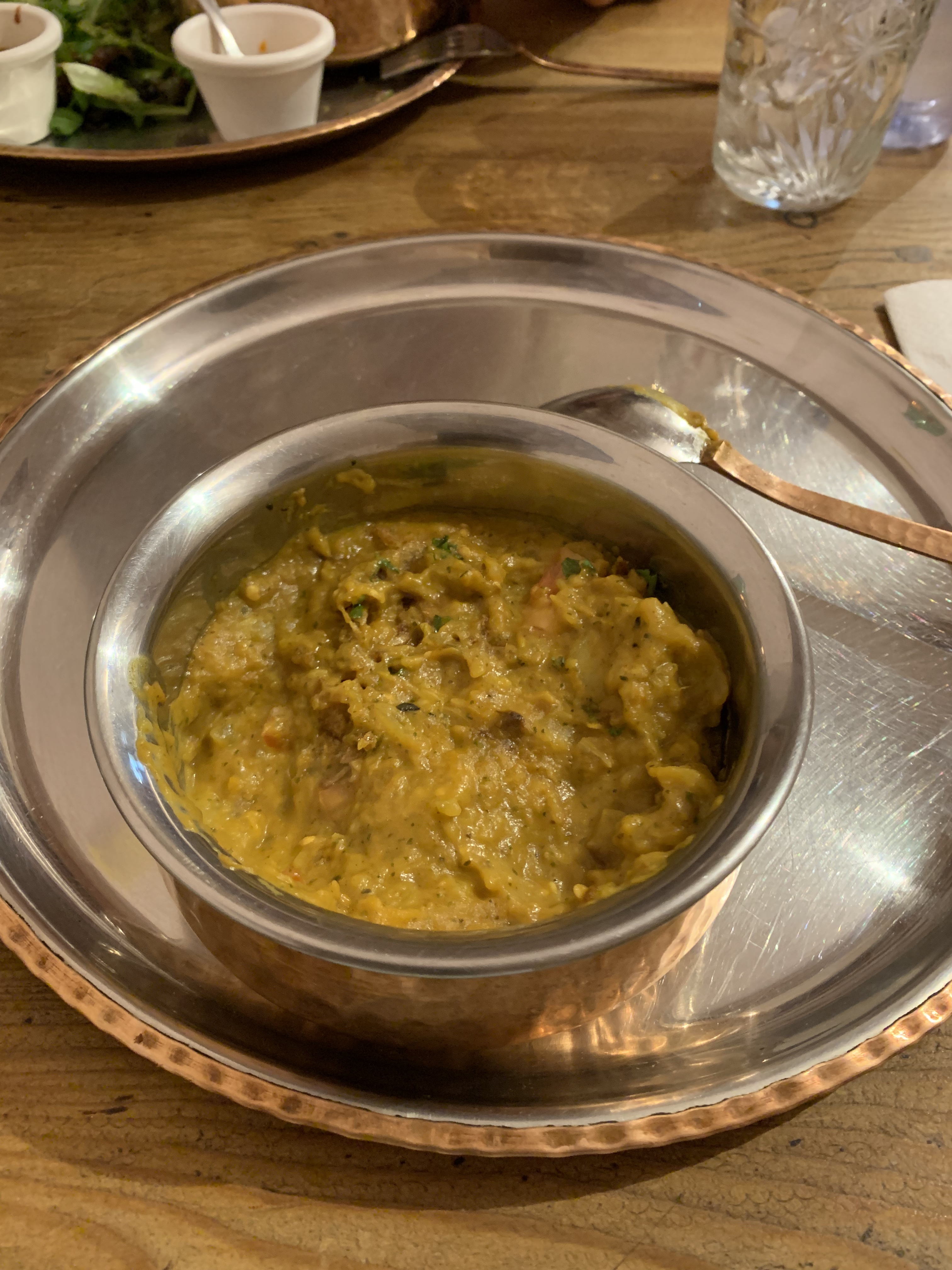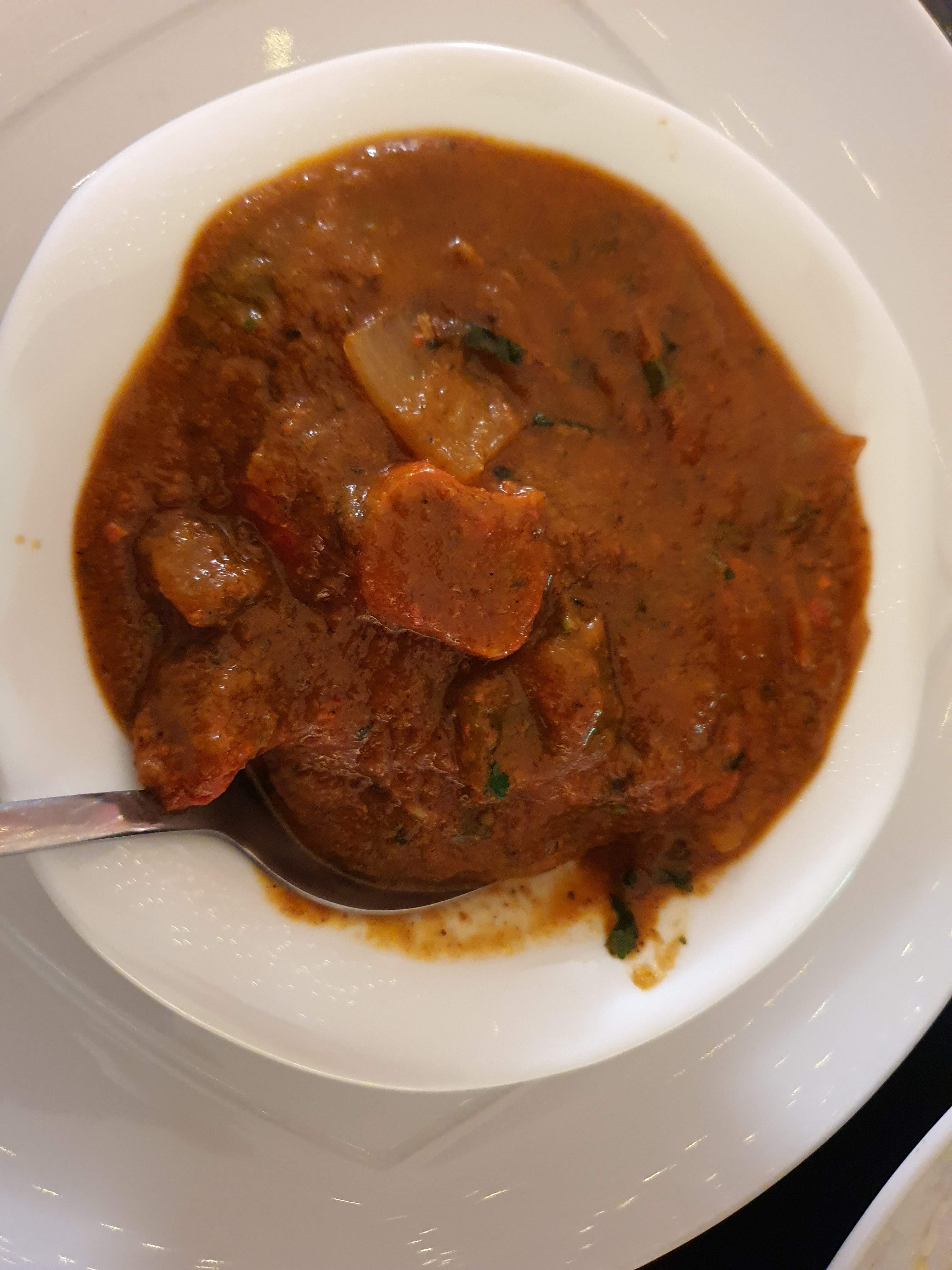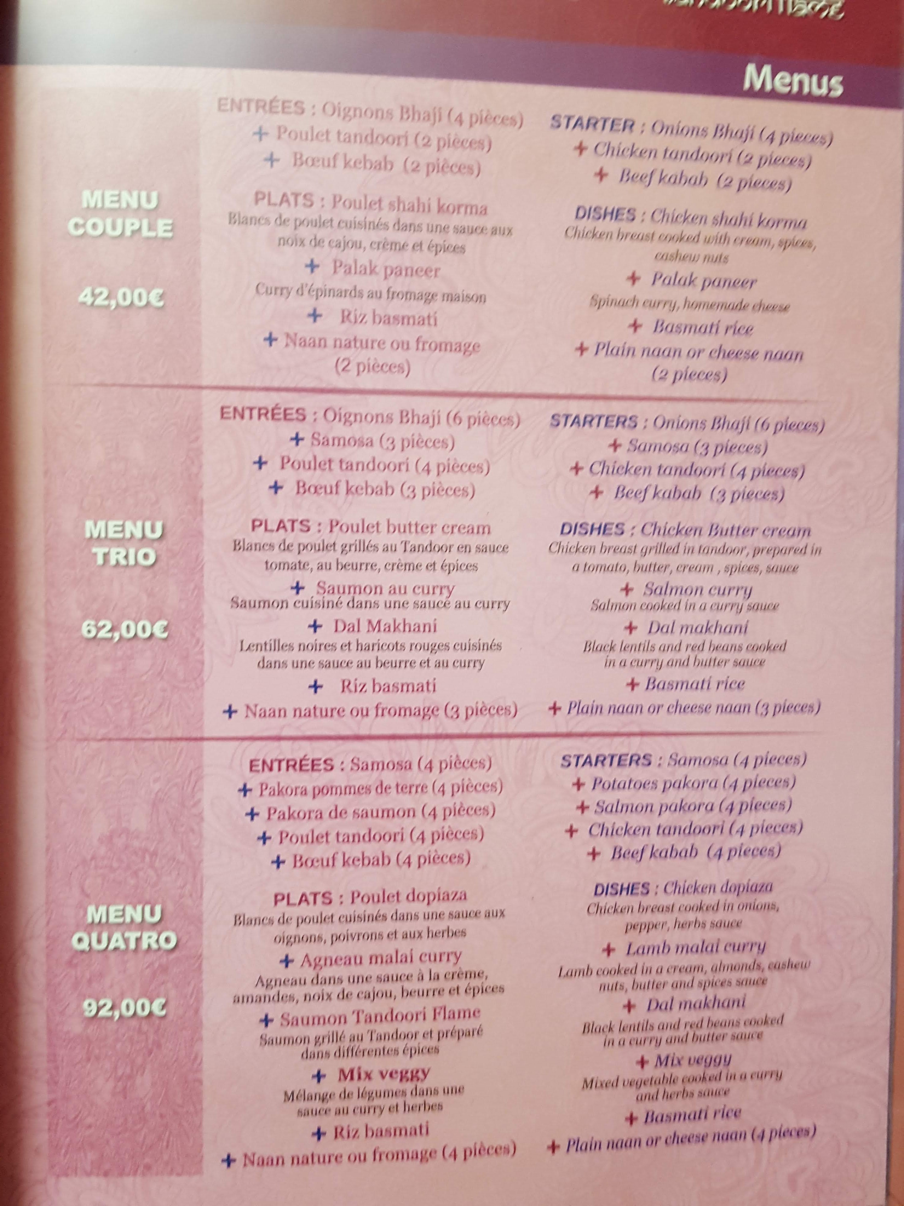 J'ai pris oignon bhaji (beignets d'oignons) pour entrée et agneau Madras pour plat principal. L'agneau qui prétendait être le plat principal s'est révélé être quelques morceaux de viande qui flottait dans un lac de sauce tomate sans aucun saveur. Cela ne m'était jamais arrivé de goûter un plat d'agneau sans sentir ni le parfum ni le saveur de cette formidable viande :Un désastre culinaire total et à 360 degrés. Quant au beignets d'oignons là aussi le saveur n'était pas au rendez-vous nonobstant les 3 sauces inutiles servies avec. Adresse attrape touristes ou, pires, attrapes adolescents, qui sont encore trop jeunes pour comprendre ce que c'est le saveur. Je ne veux pax croire que ça c'est la cuisine indienne. 30 euros jetés a la poubelle.