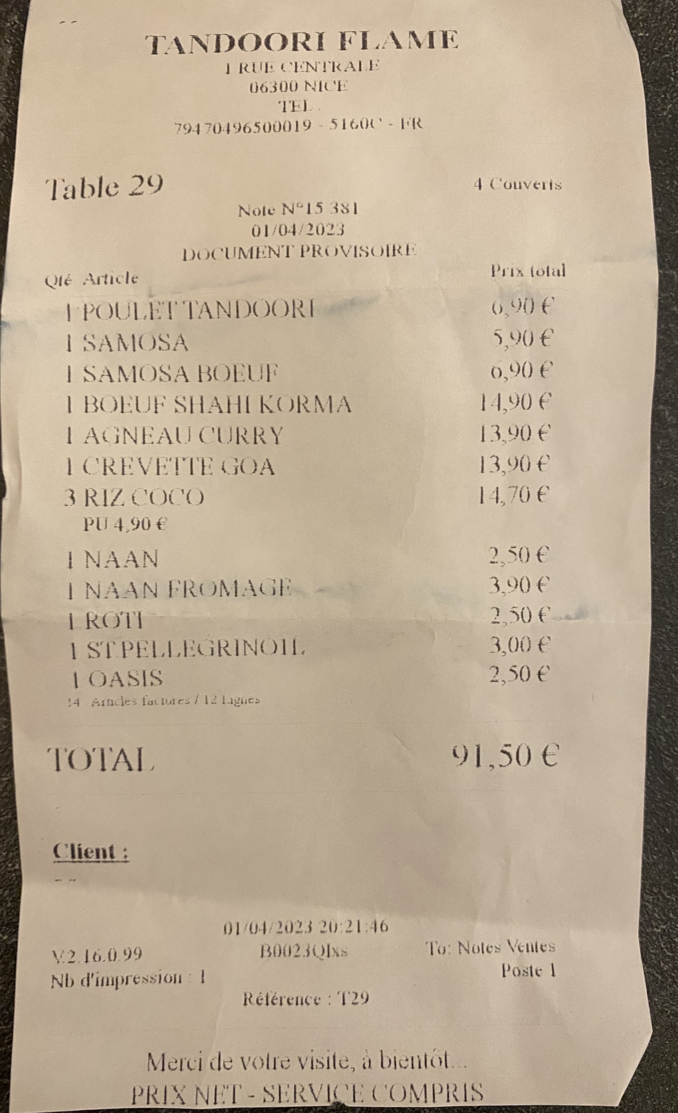 Excellent. Rien à dire de négatif. Service rapide et courtois. Nourriture indienne traditionelle et vraiment excellente. Le chef est un pro. Cuisiné sur place, épices vraiment exceptionnelles
